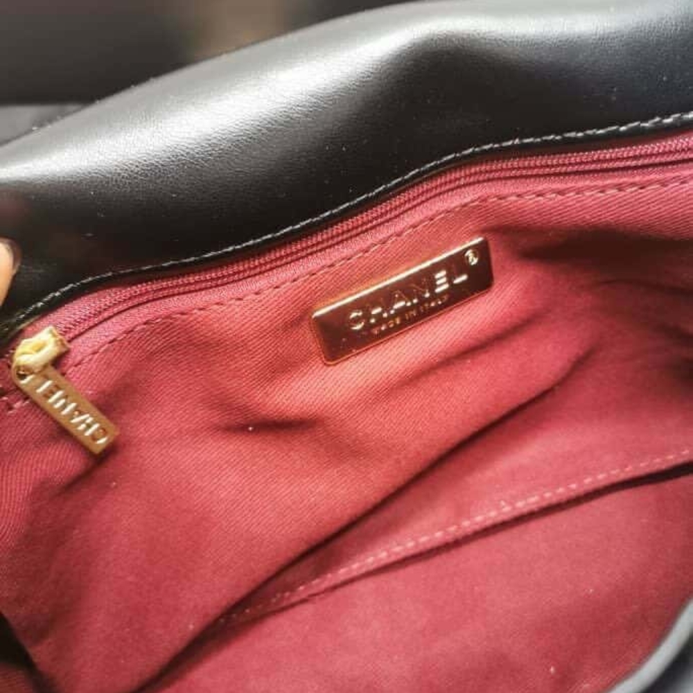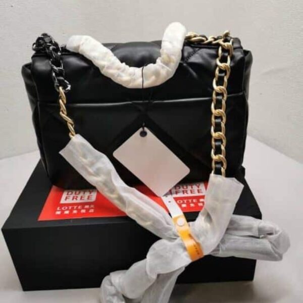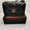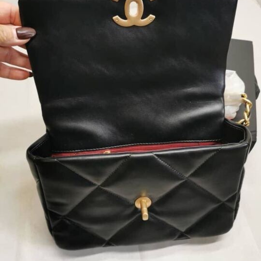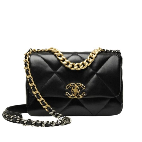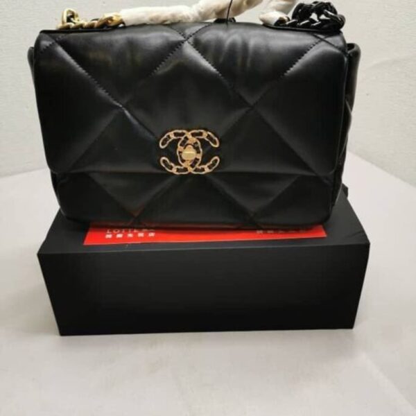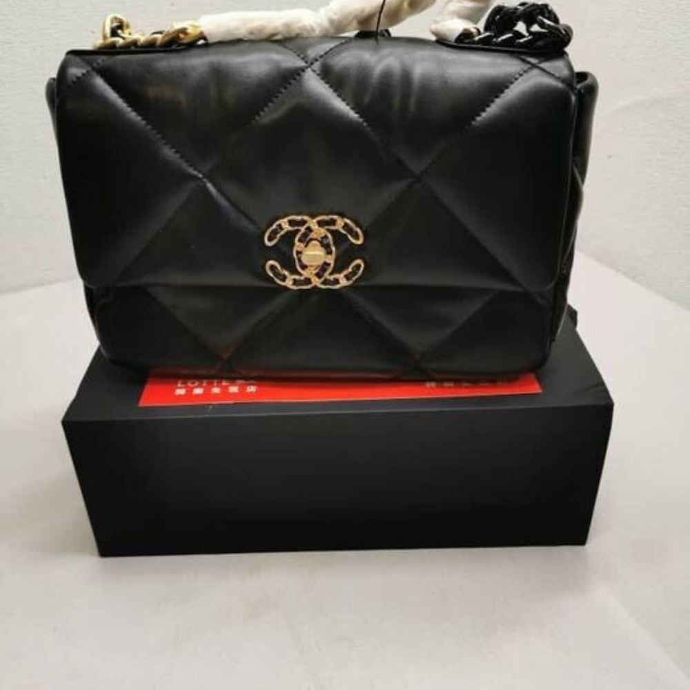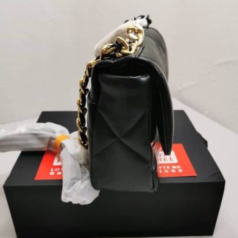The Chanel 19 Flap Bag in black with gold and silver-tone accents is the ultimate symbol of timeless elegance and modern edge. Its bold quilting and gleaming chain details exude an aura of prestige, affirming your style with effortless sophistication.