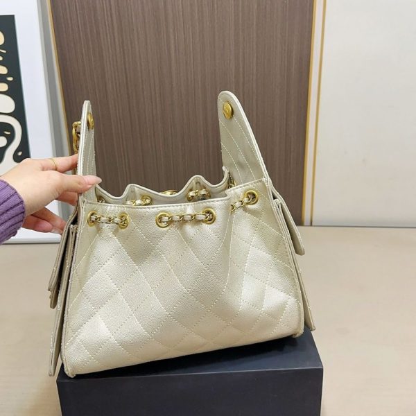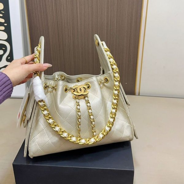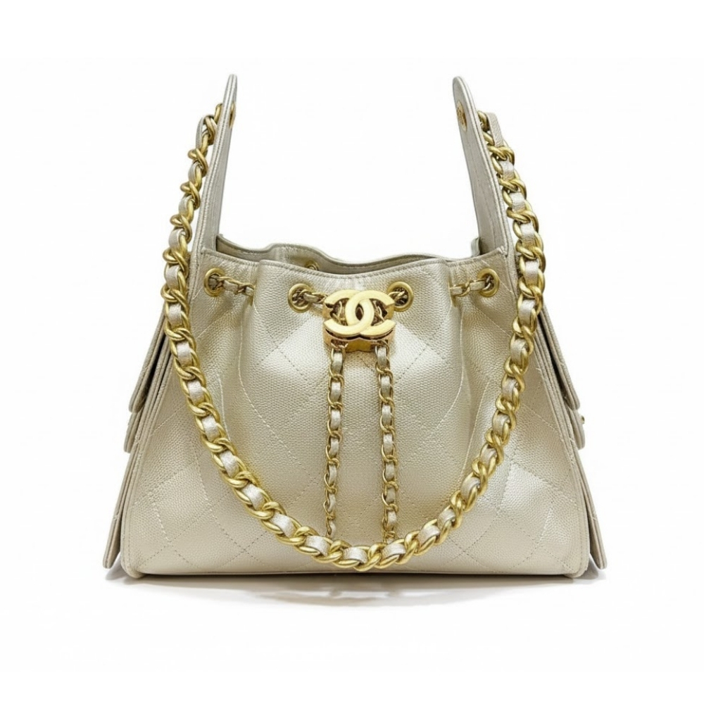 Crafted from Light Yellow quilted leather, this bag from Chanel exudes elegance and sophistication. It features the signature “CC” logo turn-lock clasp on the front, complemented by a gold-tone metal chain strap interwoven with white leather, creating a perfect balance of modernity and classic charm. The combination of the gold chain and luxurious cream leather makes this bag an ideal choice for those seeking a minimalist yet captivating design.