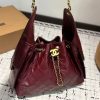 The Chanel 25 Small Handbag in shiny crumpled leather, presented in a rich burgundy color. It features gold-tone metal hardware, including the signature CC logo and chain accents. The 26cm bag has a structured yet flexible design, with a unique drawstring closure, making it both a stylish and functional accessory for day or evening wear.