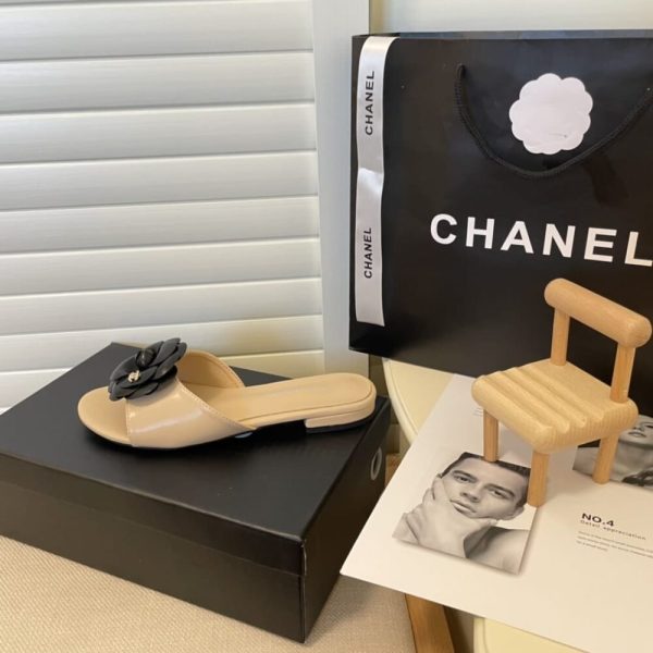 Chanel Black Camellia Slides Beige