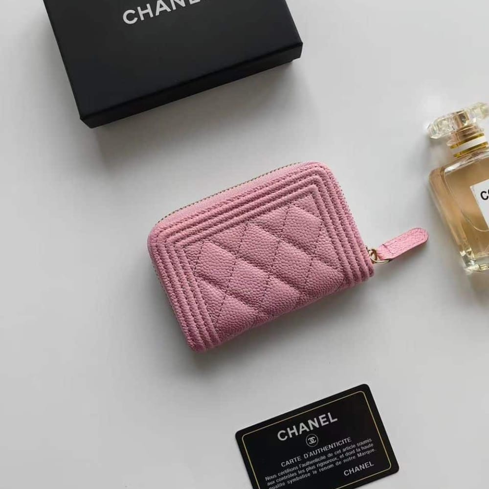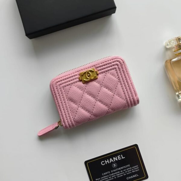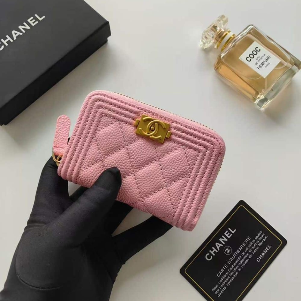 The Chanel Boy Flap Card Holder Wallet in pink with gold accents blends playful charm with the bold elegance of the Boy line, showcasing its iconic quilting and structured design. A refined expression of prestige in a petite form, it brings a touch of timeless luxury to every detail of your style.