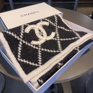CHANEL CASHMERE SILK QUILTED CC SCARF BLACK WHITE 195CM