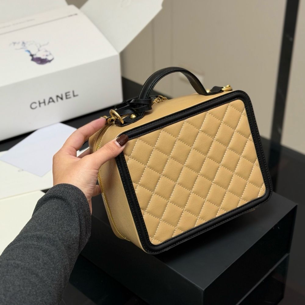 This Chanel Medium CC Filigree Vanity Case is in beige and black leather with antique gold hardware, featuring signature diamond quilting, CC stitched logo with gold accents on front of bag, dual zip around closure, a leather top handle, and a chainlink and leather shoulder strap. This bag is spacious enough for all of your travel necessities with the timeless quality and style only from Chanel.