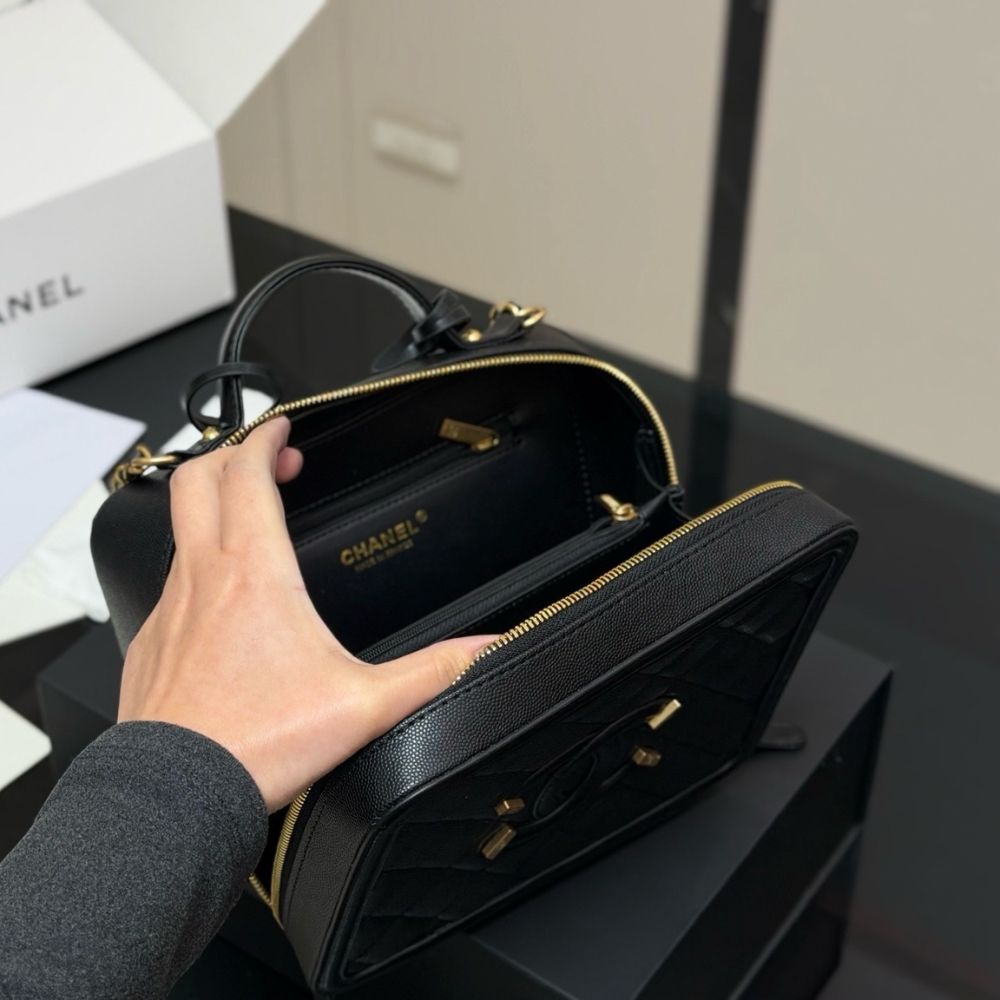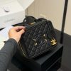 This Chanel Medium CC Filigree Vanity Case is in black leather with antique gold hardware, featuring signature diamond quilting, CC stitched logo with gold accents on front of bag, dual zip around closure, a leather top handle, and a chainlink and leather shoulder strap. This bag is spacious enough for all of your travel necessities with the timeless quality and style only from Chanel.