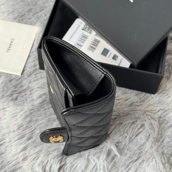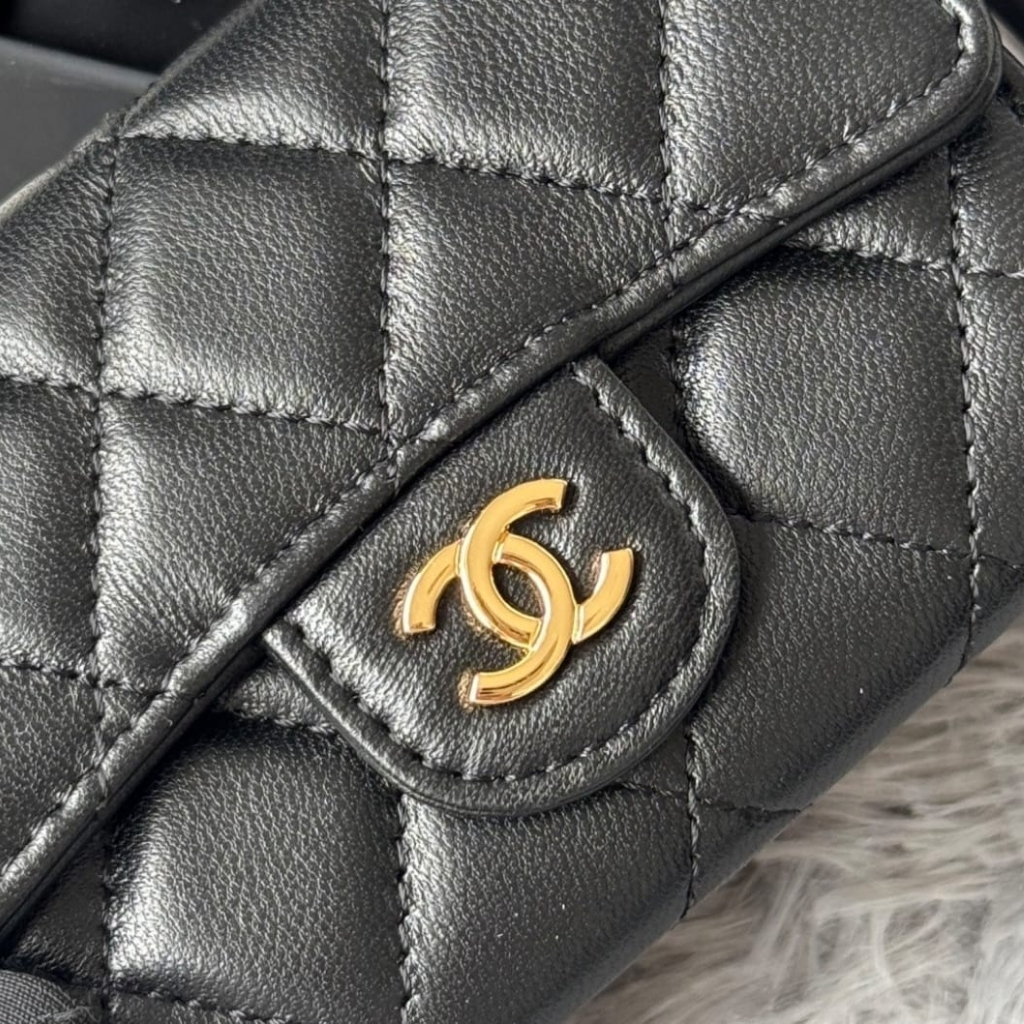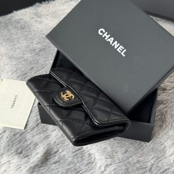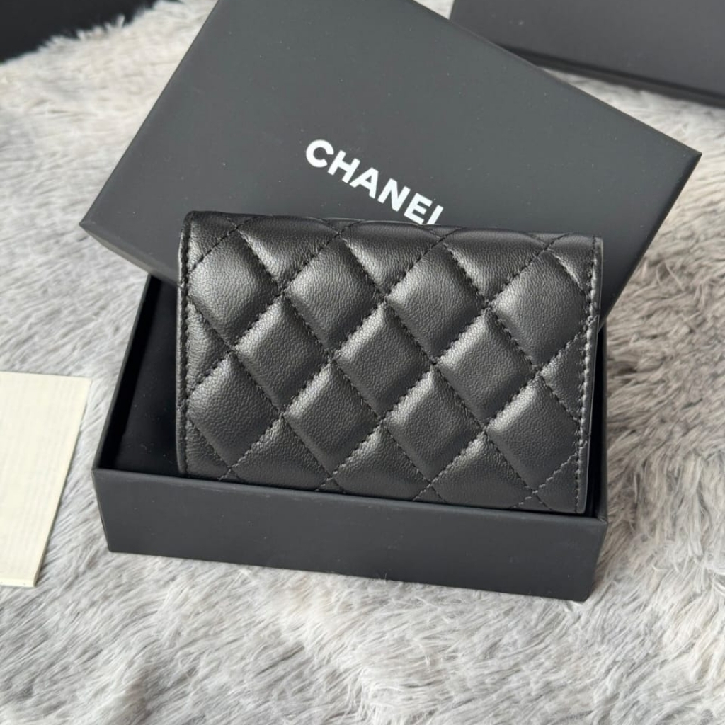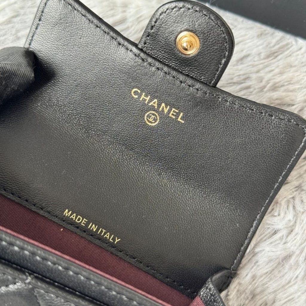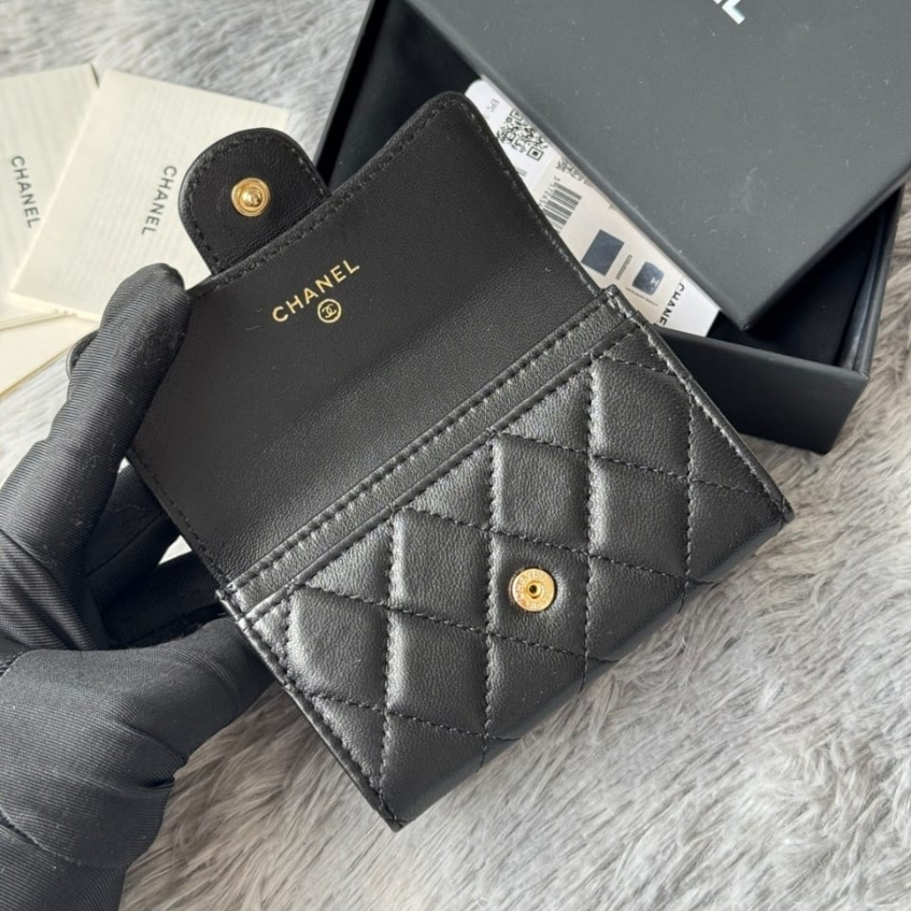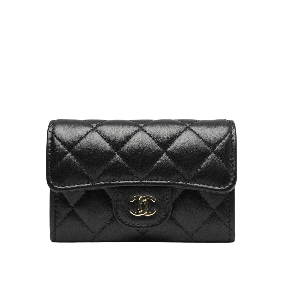 A compact essential that delivers pure Chanel elegance in its most minimal form. Crafted from black quilted leather, this card holder features the iconic CC logo in gold-tone hardware, creating a refined contrast that feels both timeless and NEWurious.