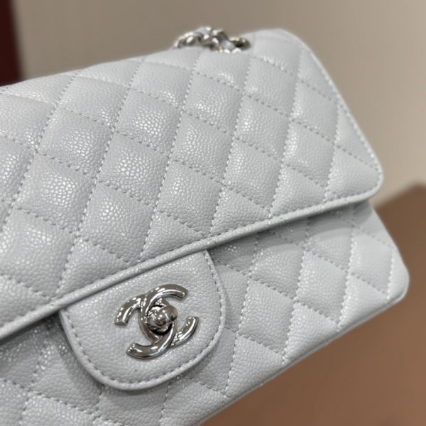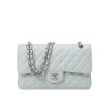 The Chanel Classic Double Flap Bag in Medium size features a soft baby blue leather finish with iconic diamond quilting and gleaming silver hardware, representing the pinnacle of timeless luxury and sophisticated design.