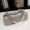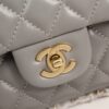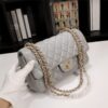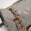The Chanel Classic Flap in gray with gold hardware exudes understated elegance and timeless versatility. Its iconic design and neutral tone make it the perfect statement of refined style for any occasion.