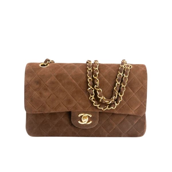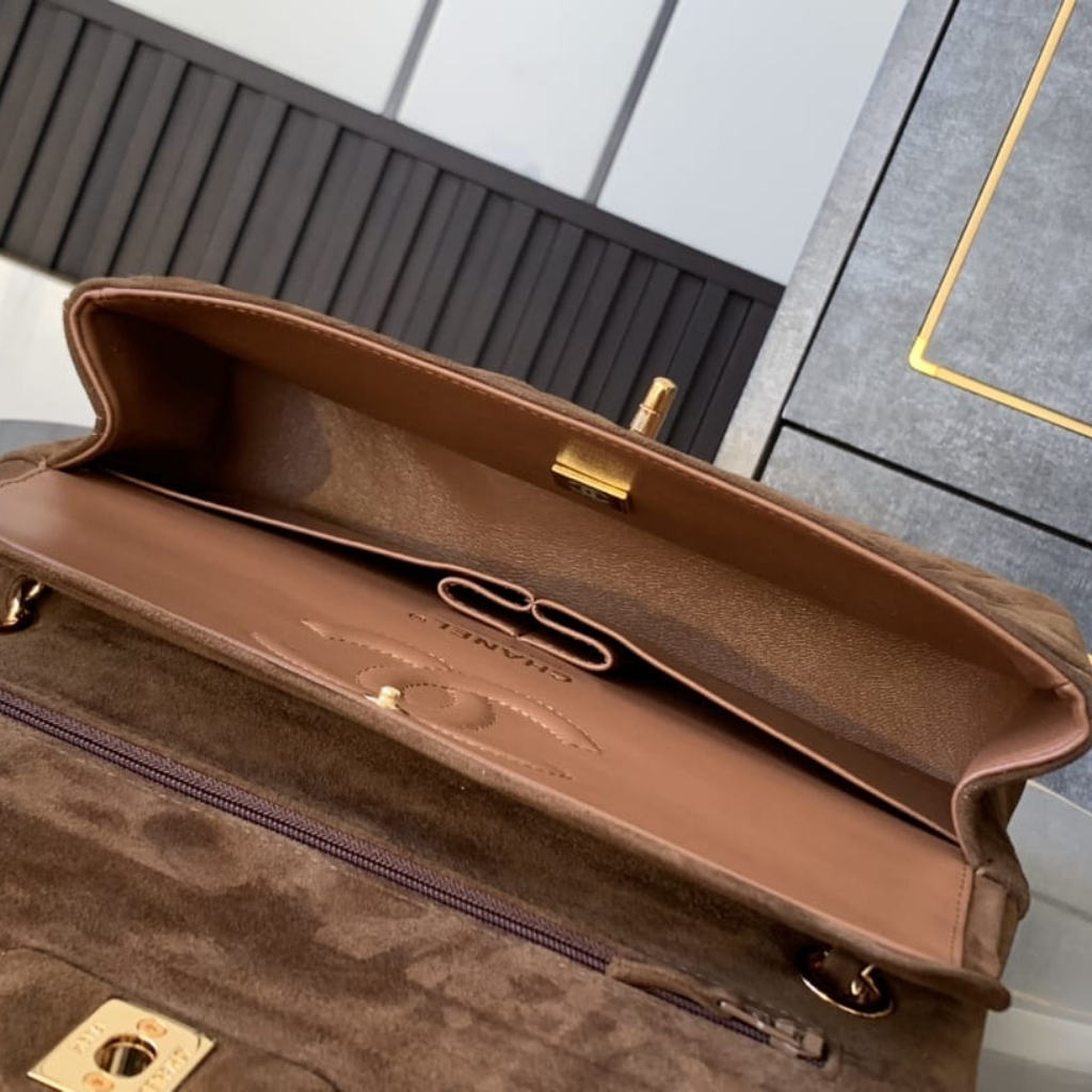 The Chanel Classic Medium Double Flap Bag in dark brown suede, featuring a signature quilted design. It is equipped with gold-tone hardware, including the iconic CC turn-lock closure and a chain strap for versatile wear. Measuring 25cm, this timeless bag offers both luxury and practicality, making it a perfect choice for both formal and casual occasions.
