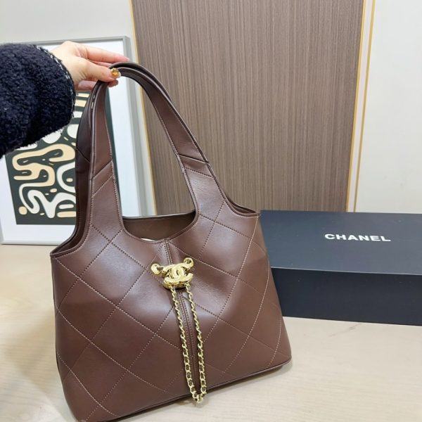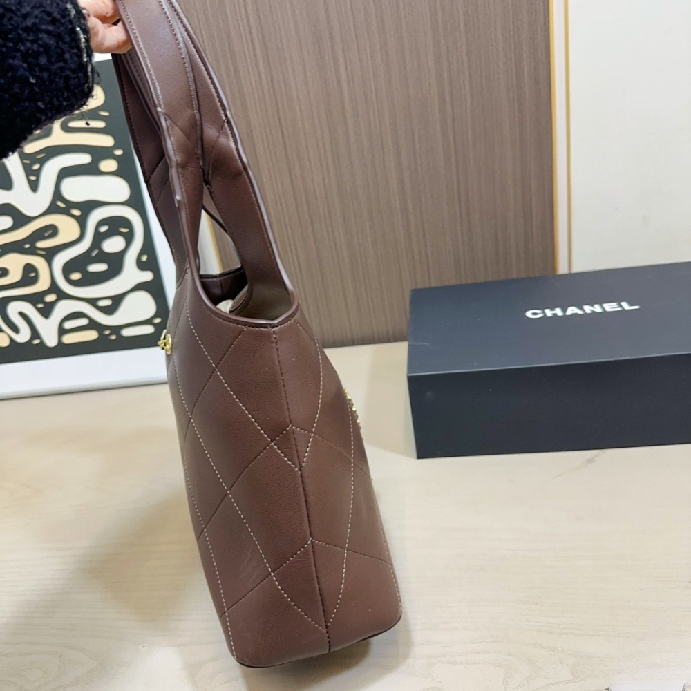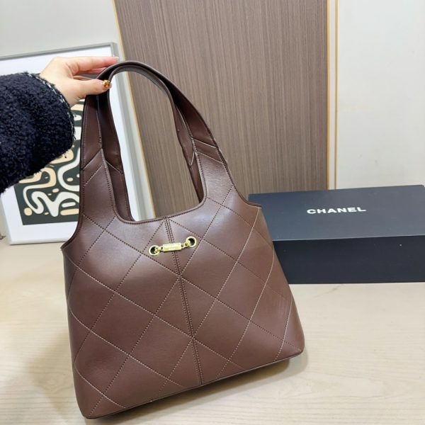 The Chanel Large Shopping Bag in brown leather features the House’s signature diamond quilting and a refined silhouette, accented by a decorative gold-tone CC chain detail that adds a touch of timeless luxury to a highly functional everyday tote.