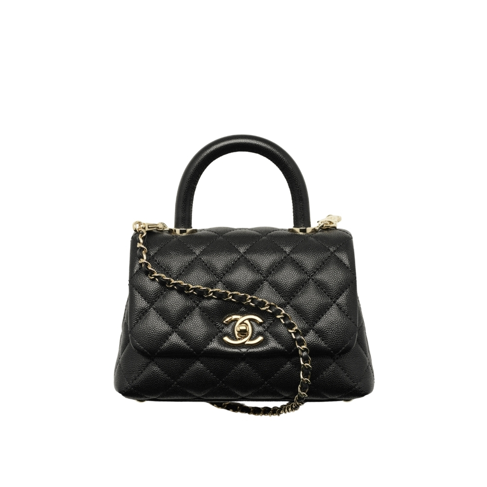 The Chanel Mini Flap Bag with Top Handle in black grained leather is a sophisticated micro-accessory that perfectly captures the House’s timeless elegance. Featuring the iconic diamond quilting, a sturdy curved top handle, and the classic CC turn-lock, this petite piece is a versatile must-have for those who appreciate refined craftsmanship in a compact silhouette.