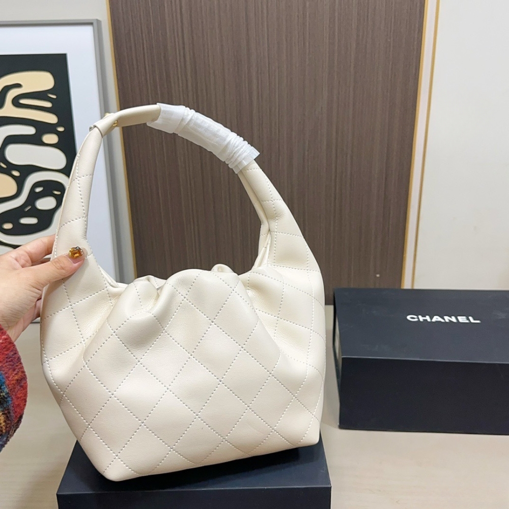 The Chanel Mini Hobo Handbag in beige leather features the House’s signature diamond quilting and a modern, curved silhouette. Accented by a decorative gold-tone CC chain detail, this compact accessory offers a perfect blend of timeless elegance and contemporary style.