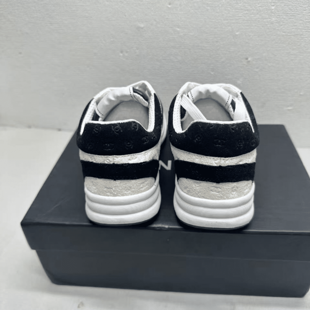 The Chanel Printed Suede Calfskin Sneakers in White and Black blend timeless elegance with bold contemporary flair, showcasing the maison’s signature codes in every detail. Designed for both comfort and prestige, they bring an effortless touch of luxury to everyday sophistication.