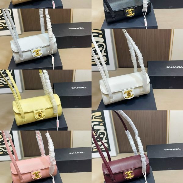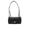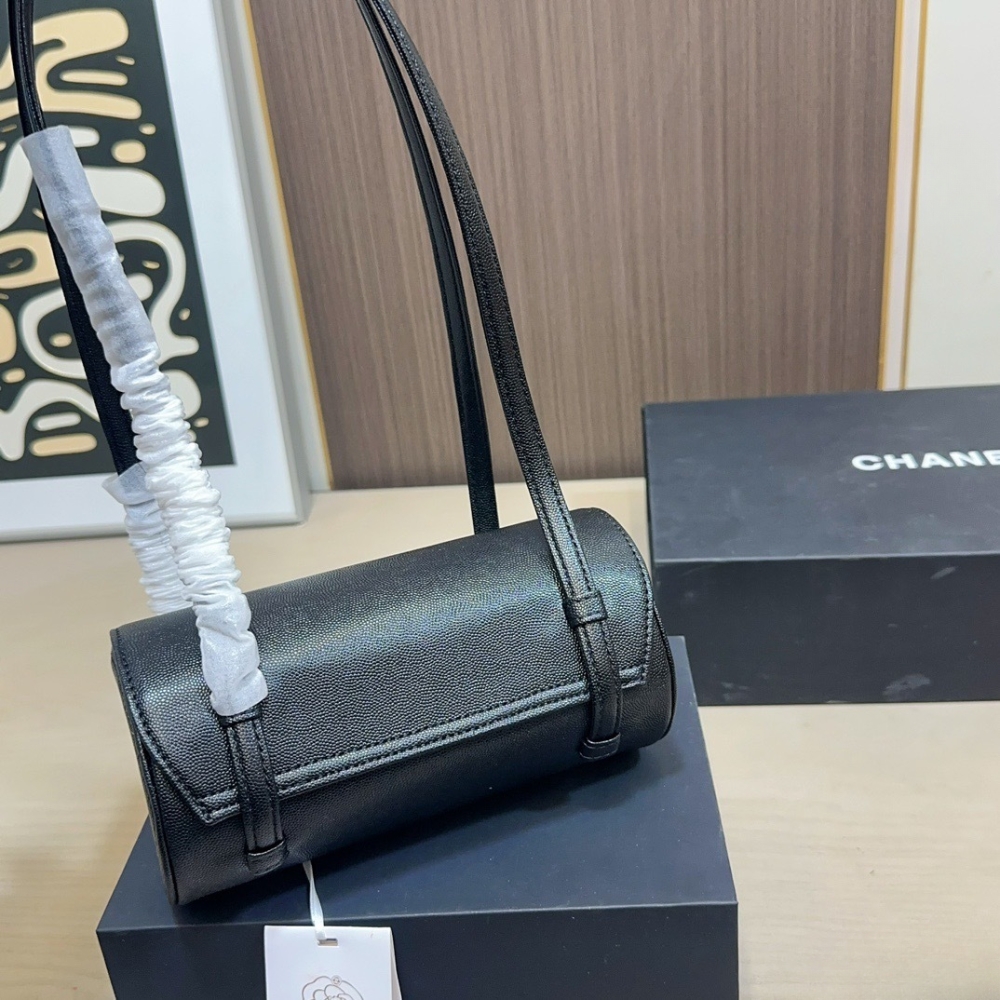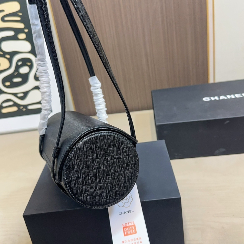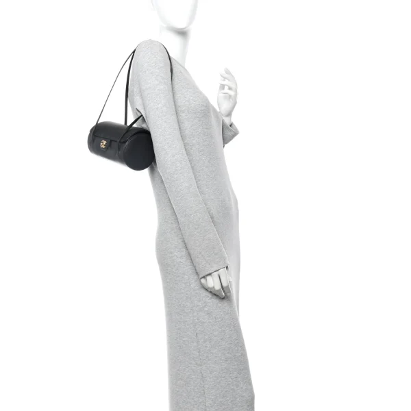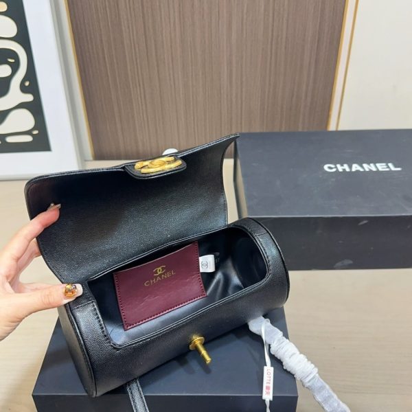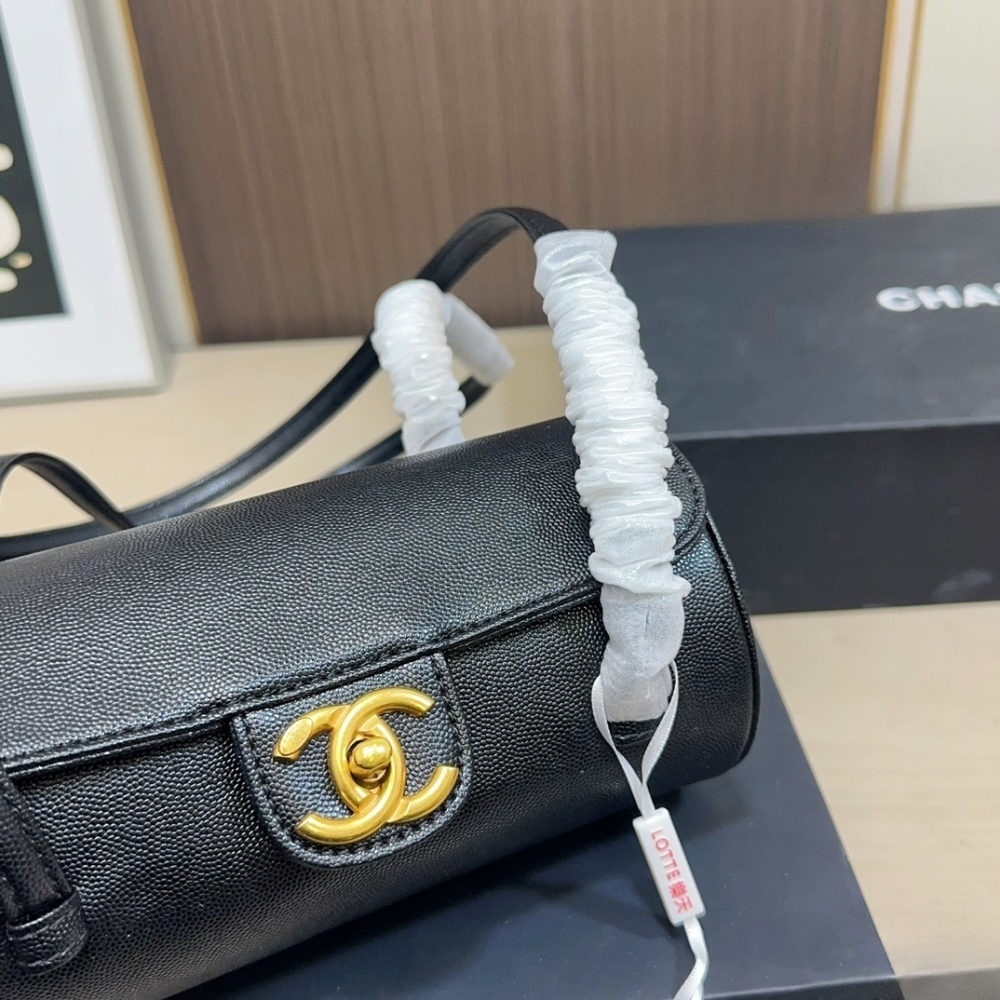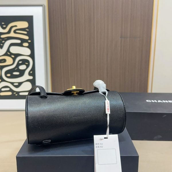 The Chanel Small Bowling Bag in black grained leather features a unique cylindrical silhouette and a minimalist aesthetic, accented by the iconic gold-tone CC turn-lock closure that brings a touch of classic Chanel elegance to a contemporary design.
