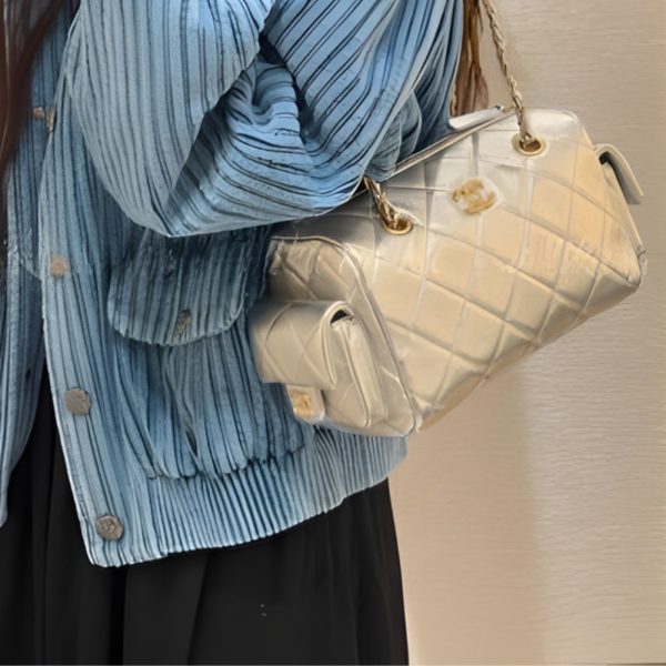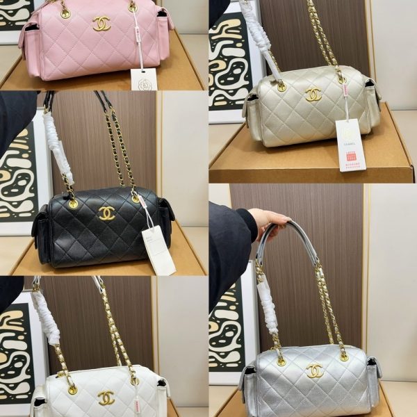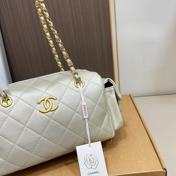 The Chanel Small Bowling Bag in light Beige is a sophisticated and practical accessory crafted from quilted leather. This model features a structured yet compact silhouette, accented by radiant gold-tone hardware and the iconic interlocking CC logo. Its versatile design includes a sturdy leather-interlaced chain strap and convenient side pockets, making it an ideal choice for organized daily luxury.