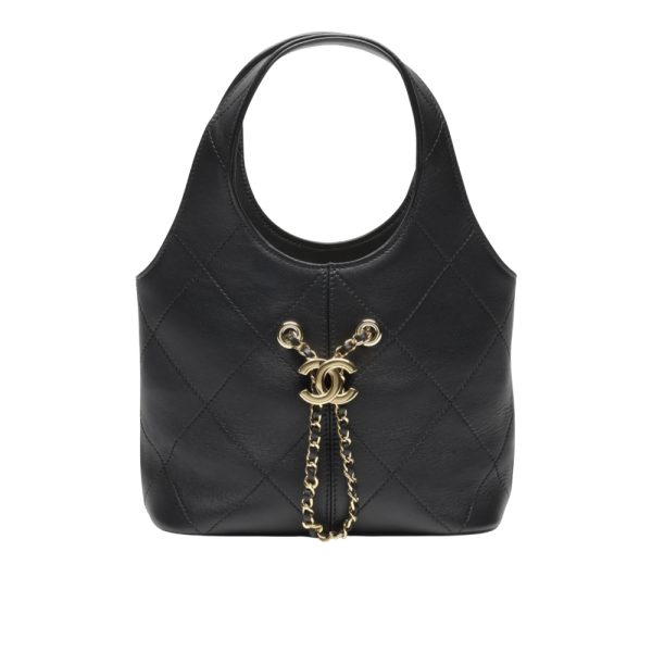 The Chanel Small Shopping Bag Gold Tone Hardware Black features a refined, structured silhouette in black quilted leather, accented by a distinctive gold-tone CC chain detail and integrated top handles, offering a timeless blend of luxury and everyday practicality.