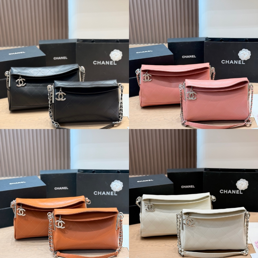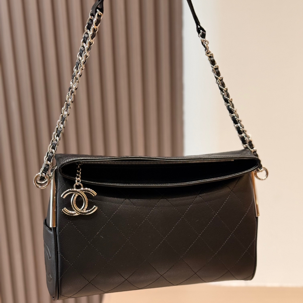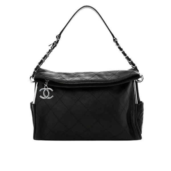 - Design: Soft hobo structure with side pockets, featuring a large interlocking CC charm and silver-finish metal accents