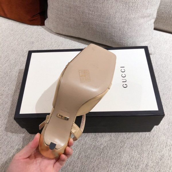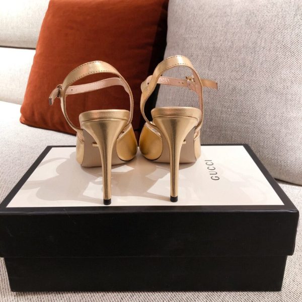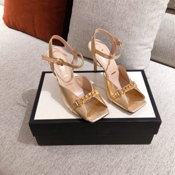 The Gucci Ankle Buckle Strap Sylvie Chain Sandals in gold shimmer with refined elegance, their radiant silhouette and iconic chain detail embodying pure sophistication. A statement of glamour and prestige, they elevate every step with timeless allure and undeniable confidence.