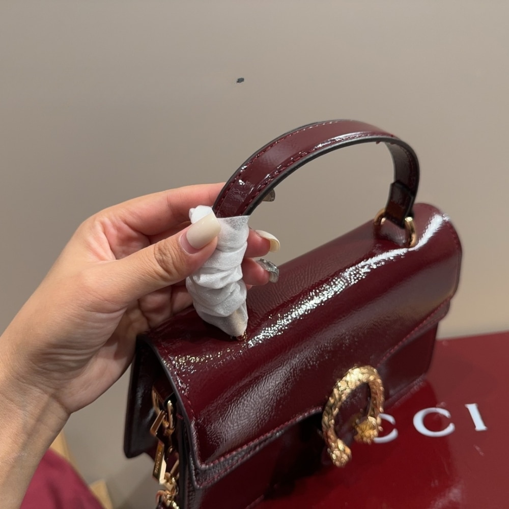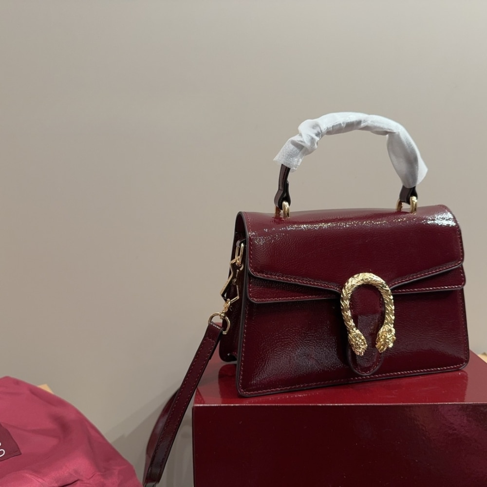 The Gucci Dionysus Top Handle Bag in deep red captivates with its bold silhouette and luminous finish, crowned by the legendary gold tiger-head closure. A symbol of strength and allure, it radiates prestige and transforms every ensemble into a statement of timeless elegance.