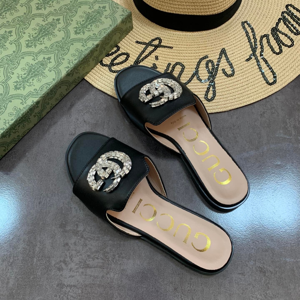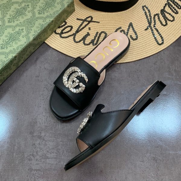 The Gucci Double G Slippers in black radiate timeless sophistication, elevated by the beaded emblem that adds a luminous statement of refinement. With sleek contours and effortless comfort, they embody iconic luxury that enhances both style and prestige.