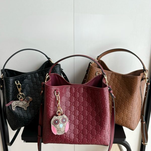 The GG Emblem collection reinterprets the House’s history of elegance and craftsmanship. This bucket bag highlights functional design with an interior compartment, in Web cotton lining.