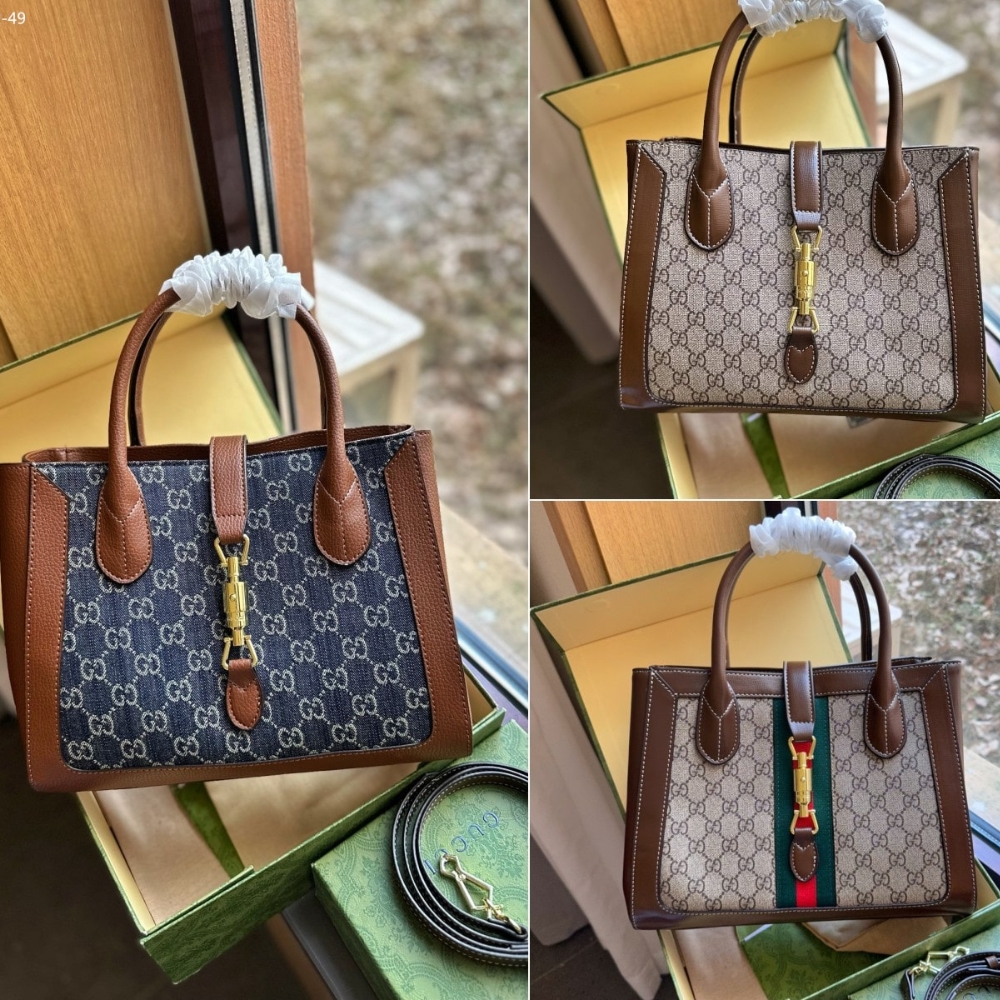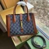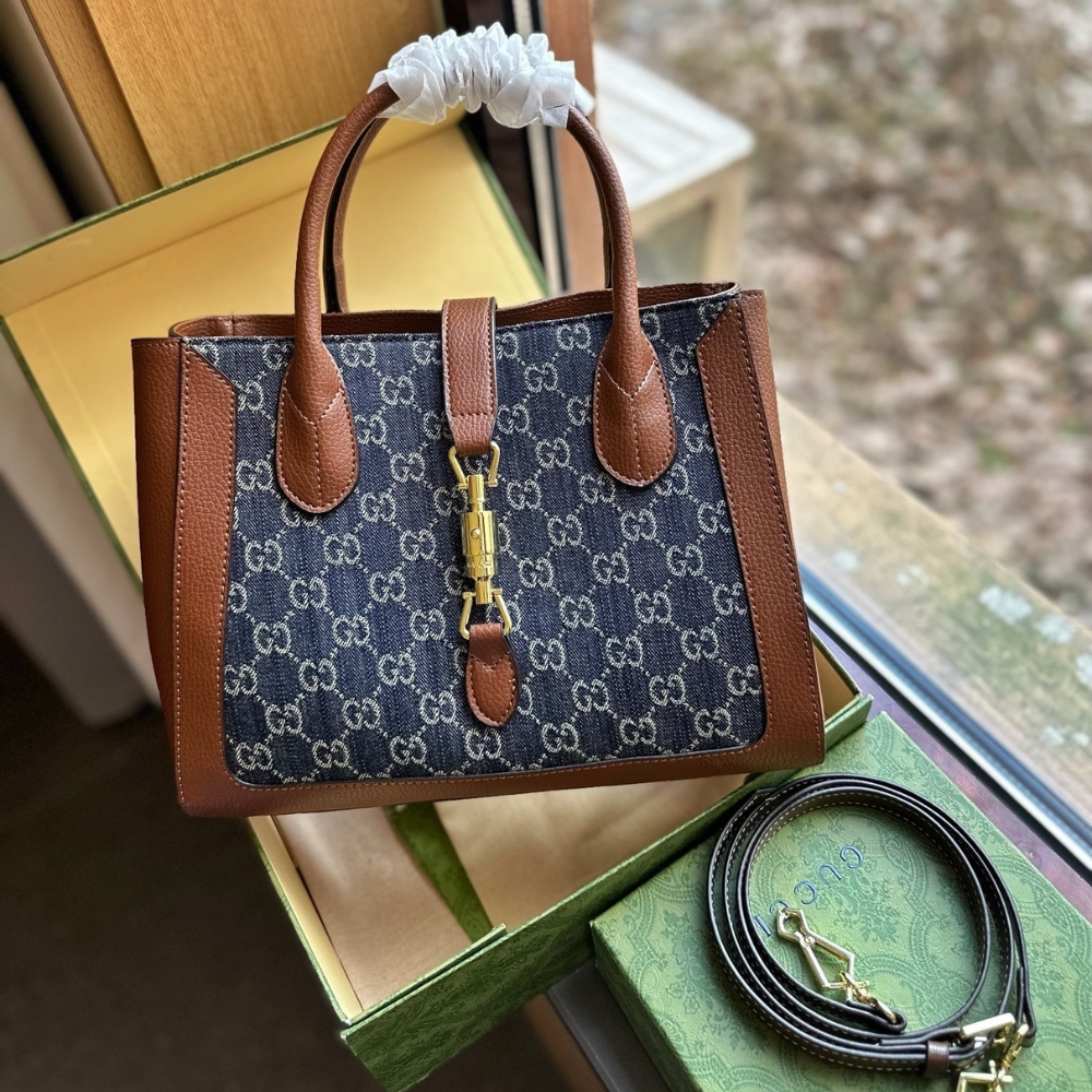 The Gucci Jackie 1961 Tote in GG denim with brown leather trim is a statement of refined versatility. Its structured silhouette, highlighted by the iconic piston closure, bridges heritage craftsmanship with modern elegance, offering a bold yet timeless presence.