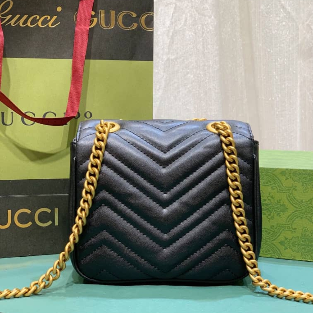 Gucci’s GG Marmont Mini shoulder bag is crafted in Italy from quilted matelassé leather with a chevron finish. The softly structured shape is adorned with the brand’s iconic double-G hardware for instant recognition – a signature that really stands out against the black leather. Tote your essentials in its suede-lined interior and adjust the sliding chain strap for a longer or shorter drop