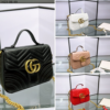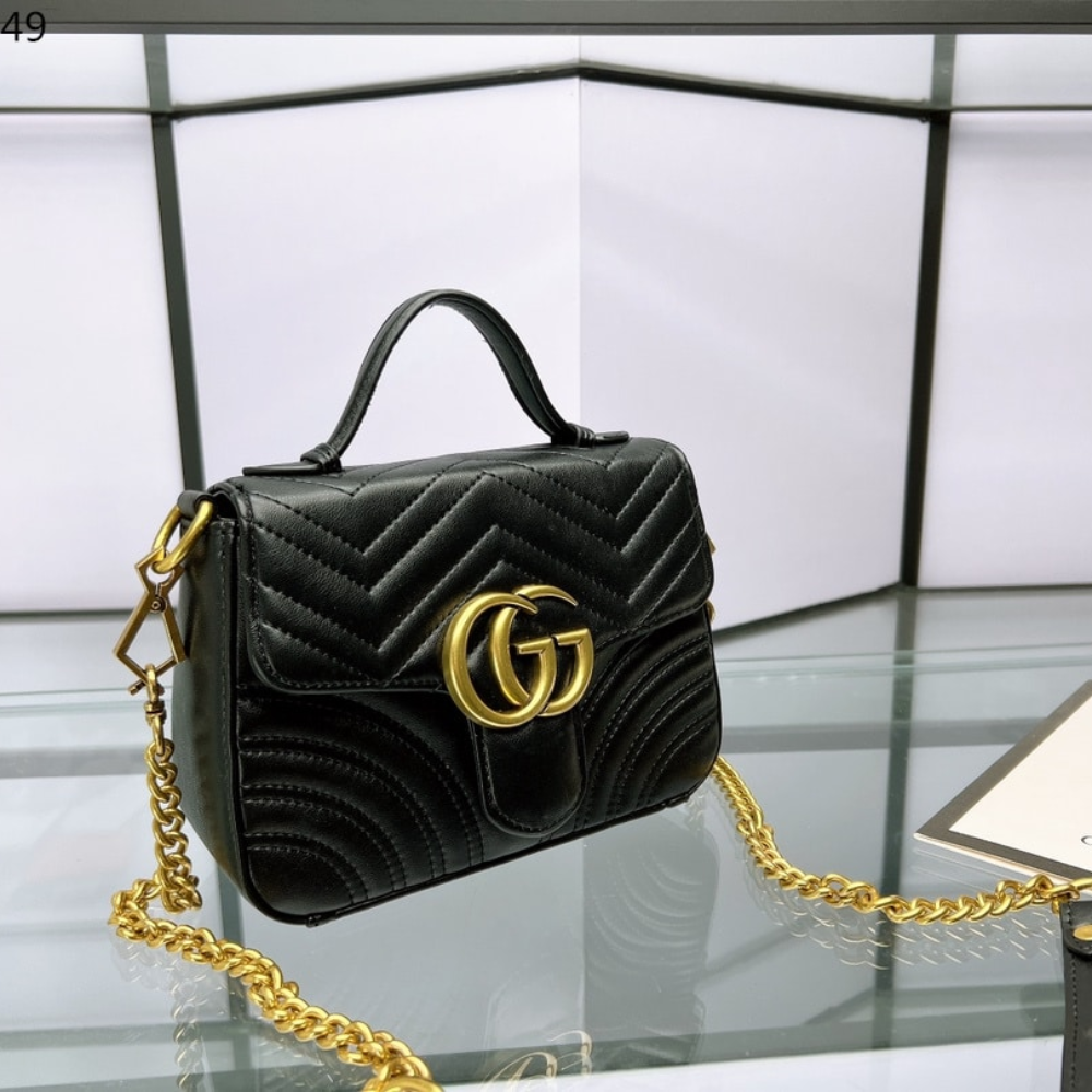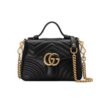 A new introduction to the GG Marmont line for Cruise 2019, the small GG Marmont top handle bag has a softly structured shape and an oversized flap closure with Double G hardware. Equipped with a leather top handle and chain shoulder strap, made in matelassé chevron leather with a heart on the back.