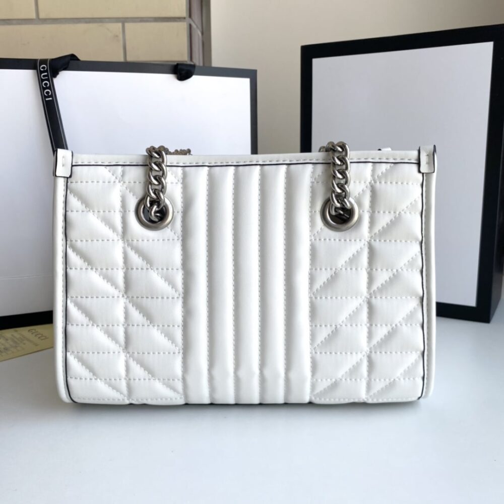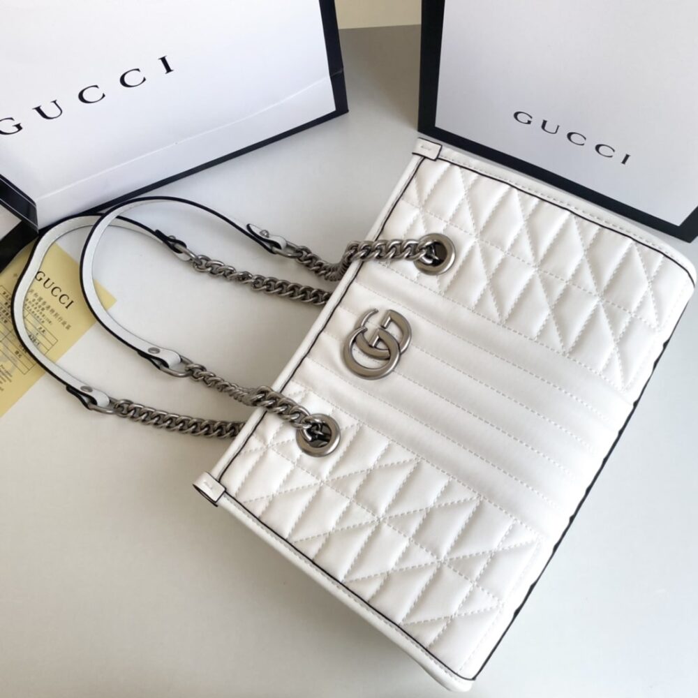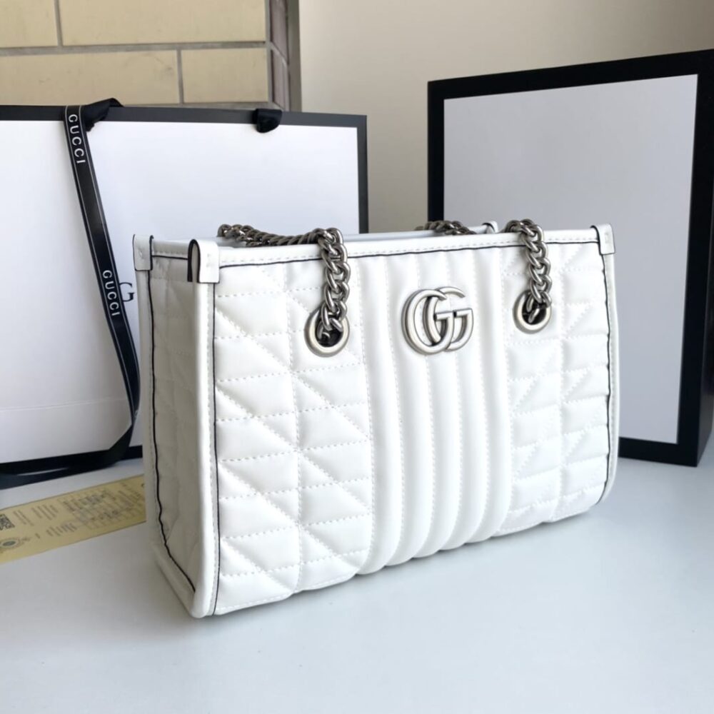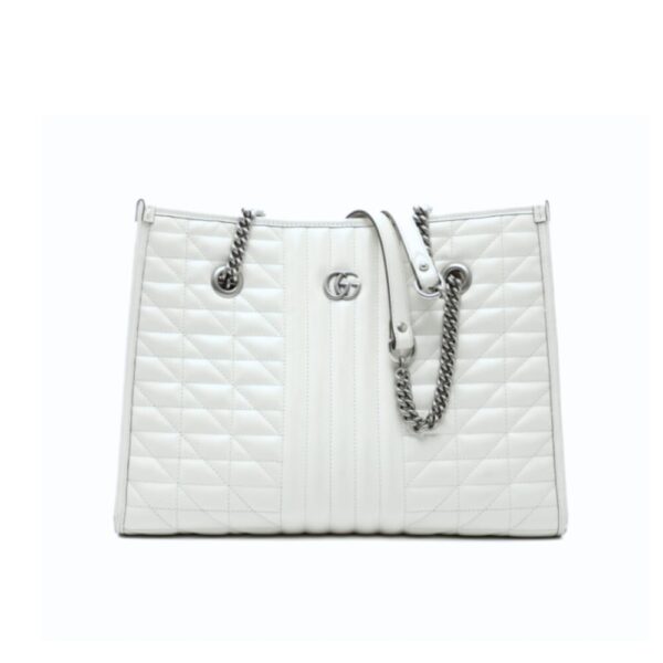 This is a Gucci GG Marmont tote bag in white. It features a diamond-quilted design with the signature interlocking GG logo in silver-tone hardware. The bag is completed with chain-and-leather shoulder straps for a chic finish.