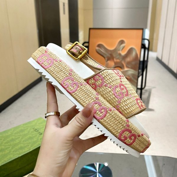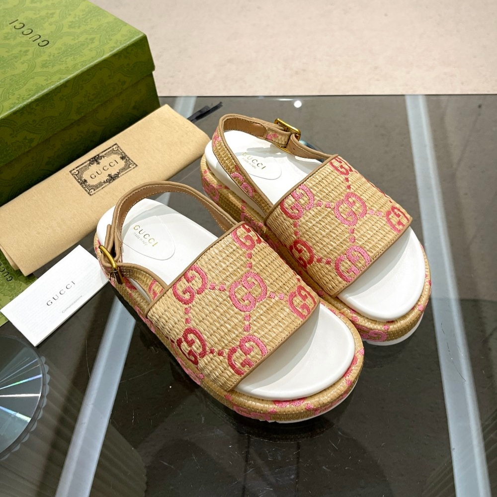 The Gucci GG Platform Sandals in beige and pink fuse iconic monogram elegance with a bold, contemporary silhouette designed for effortless comfort. A chic emblem of prestige and modern style, they elevate casual looks with an aura of sophistication and luxury.