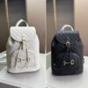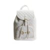 This is a Gucci backpack in white leather featuring the iconic GG monogram pattern. It has a flap closure with a buckle and drawstring detail for added security. The front pocket is adorned with Gucciâs signature horsebit hardware in gold-tone metal.