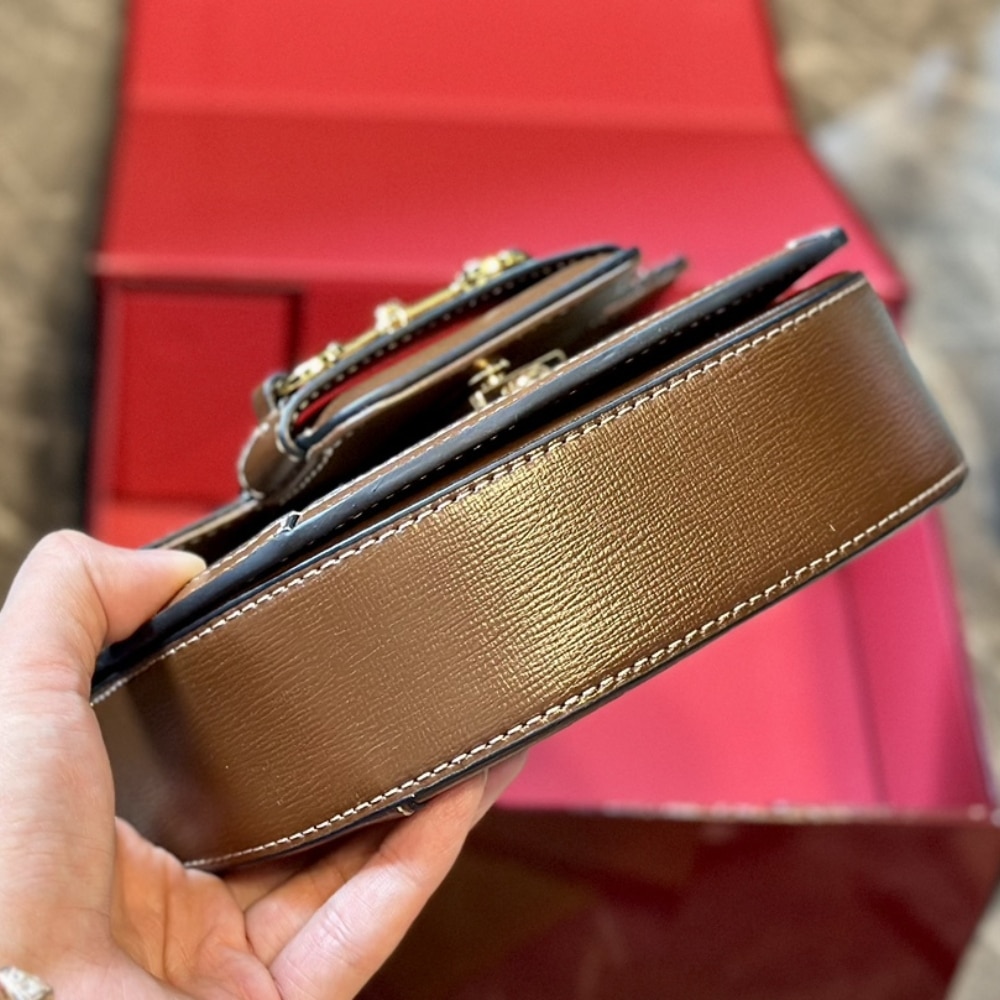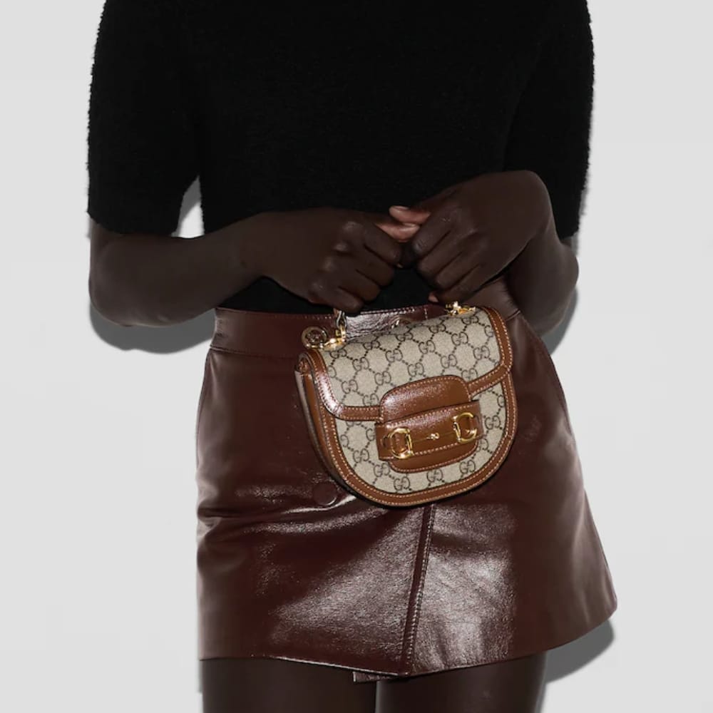 Gucci Horsebit 1955 mini handbag in beige and ebony GG Canvas and brown leather with Horsebit detail in light gold-tone metal. It features fixed top handle, adjustable and detachable shoulder strap, spring closure, two main interior compartments and one interior card slot.