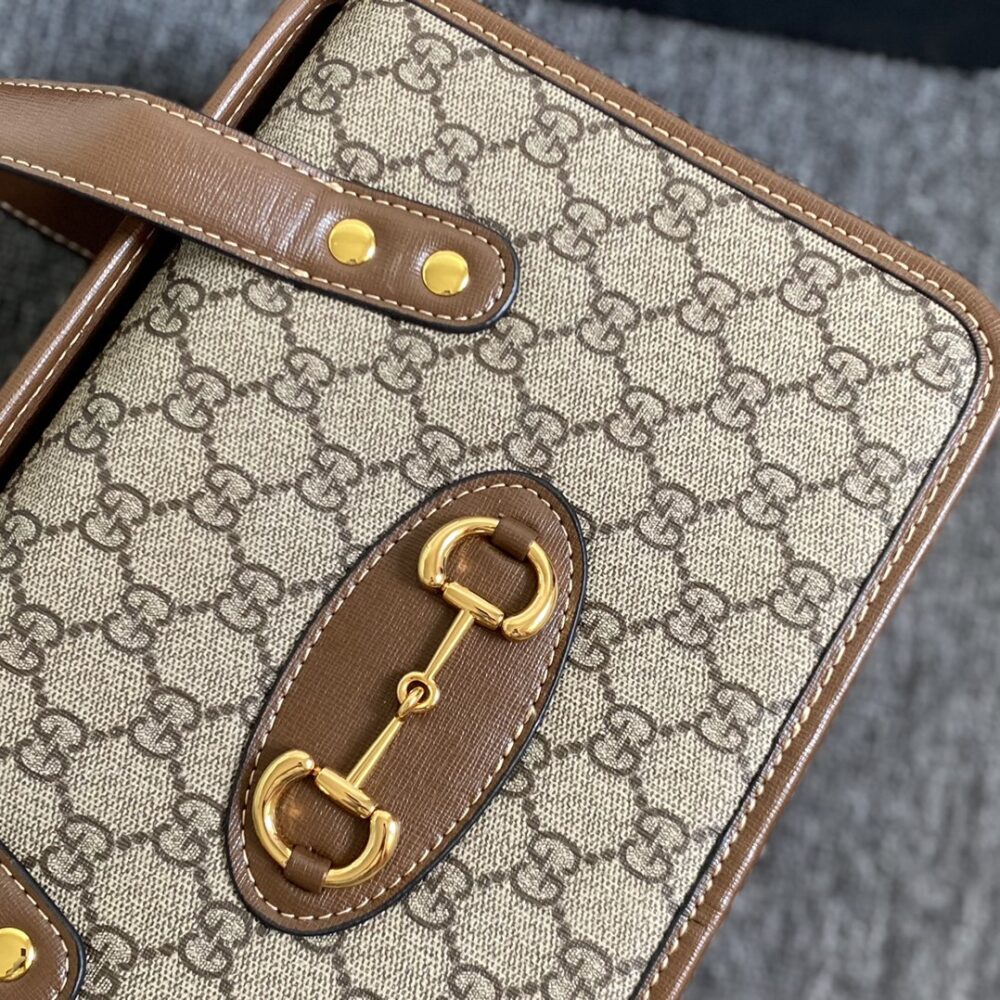 This is a Gucci Horsebit 1955 top handle bag in beige and brown GG Supreme canvas with brown leather trim. It features the signature gold-tone horsebit detail on the front and comes with both top handles and a detachable shoulder strap. The structured design combines elegance with functionality, making it a versatile everyday piece.