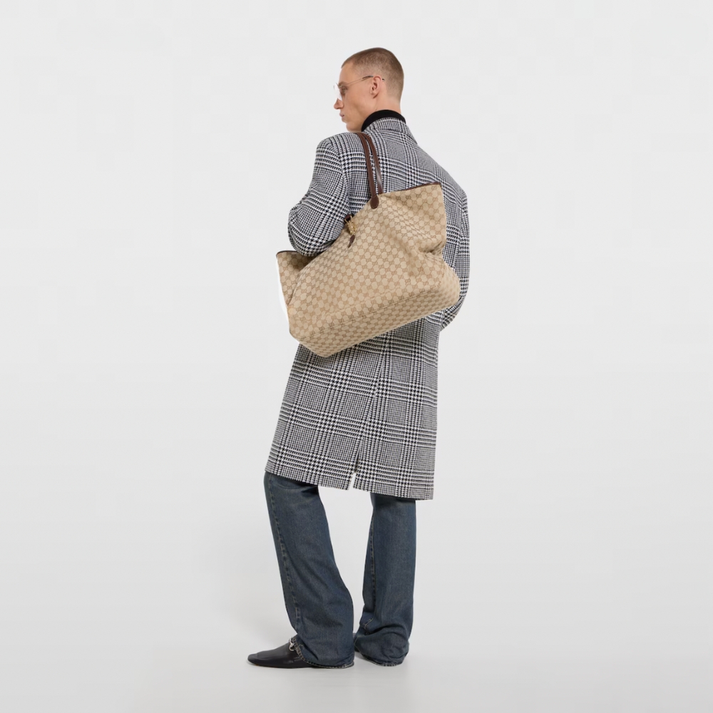 Introducing Spring Summer 2026. This new Gucci Jackie tote is crafted from structured yet lightweight GG canvas, and reveals a lining with the Diamante motif taken from the archive.