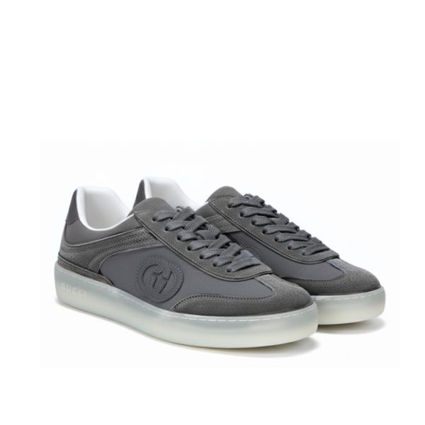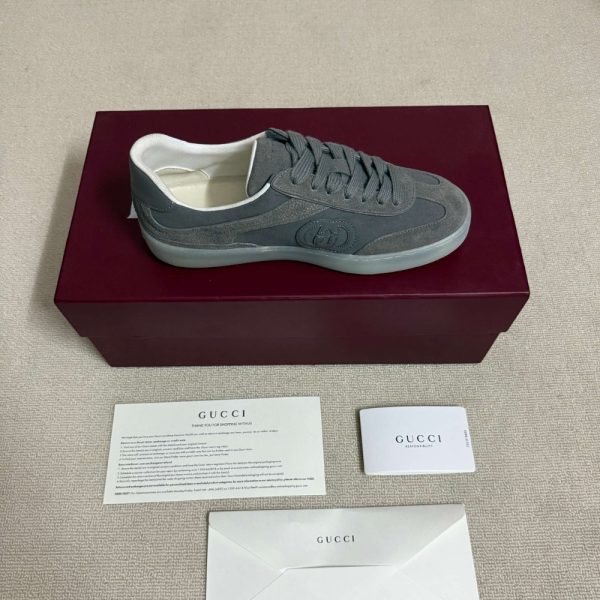 In the Fall Winter 2025 collection, inspired by retro basketball shoes from the â70s, these sneakers are defined by signature Gucci symbols such as the Interlocking G logo. This model appears in suede and leather trim.