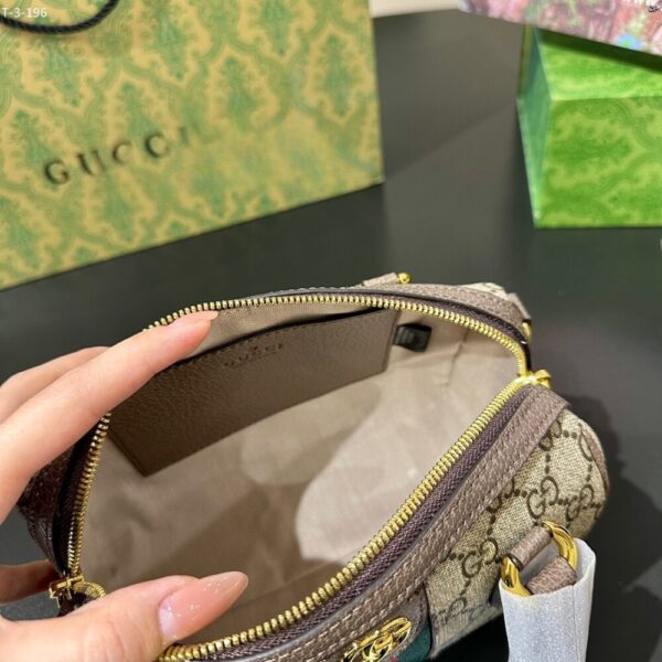 The Ophidia collection evokes the House’s heritage with the signature Web stripe and Double G emblem in light gold-toned finish. The styles are crafted from soft GG Monogram coated fabric, featuring green cotton lining inside.
