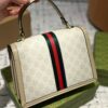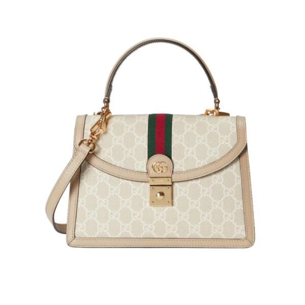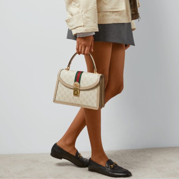One of the House’s most emblematic materials, the GG Supreme is inspired by an archival design from the ’30s. Traditionally presented in beige and ebony, the material is presented in a beige and white combination as an ode to timeless pieces and everlasting design. Here, the pattern defines this medium-sized Ophidia top handle bag.