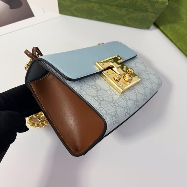 This is a Gucci Padlock shoulder bag. It features the GG Supreme canvas in a light blue tone. The bag has a gold-tone chain strap, a signature padlock closure, and a brown leather key holder detail. A chic combination of canvas and leather with a modern pastel finish.