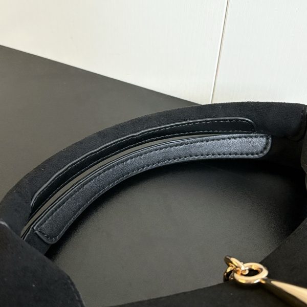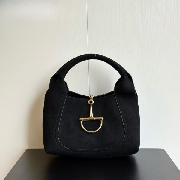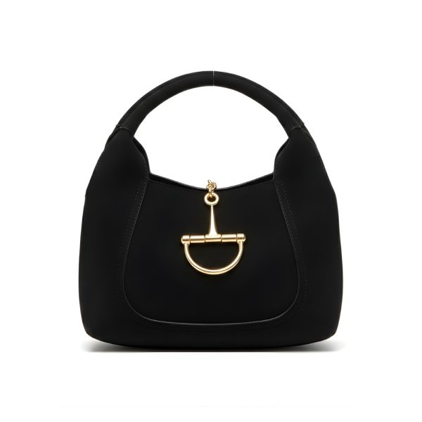 The Gucci Softbit Medium Top Handle Bag in black features a unique, curved hobo-style silhouette accented by the iconic oversized Horsebit hardware in radiant gold-tone metal. The elegant design includes a structured top handle for a comfortable hand carry and a spacious interior to accommodate your daily essentials.