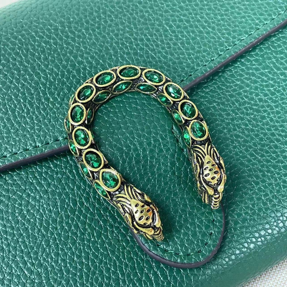 The Gucci Women Dionysus Super Mini Emerald Green captivates with its sleek contours and iconic tiger-head clasp, radiating an aura of bold sophistication. A statement of refined confidence, it transforms every glance into admiration and every moment into a celebration of your impeccable style.