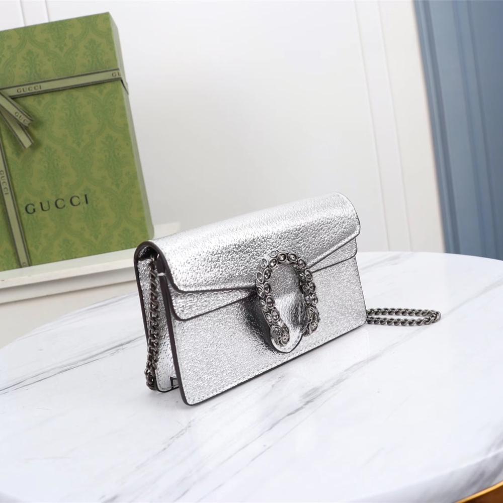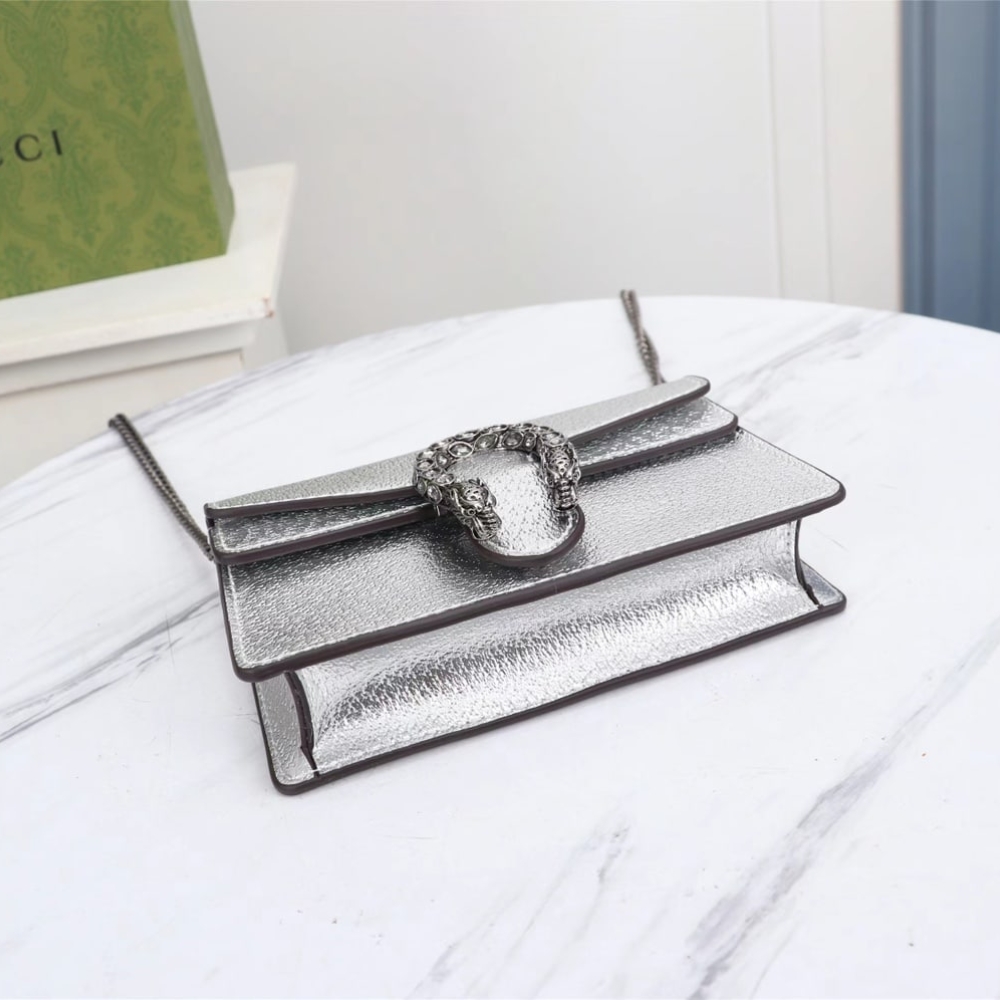 Gucci Women Dionysus Super Mini Crossbody Bag Silver 16Cm 476432 1TRBN 8173 dazzles with its luminous sheen and signature tiger-head clasp, capturing the essence of modern glamour. Radiating an air of effortless prestige, it turns every appearance into a statement of bold, radiant sophistication.