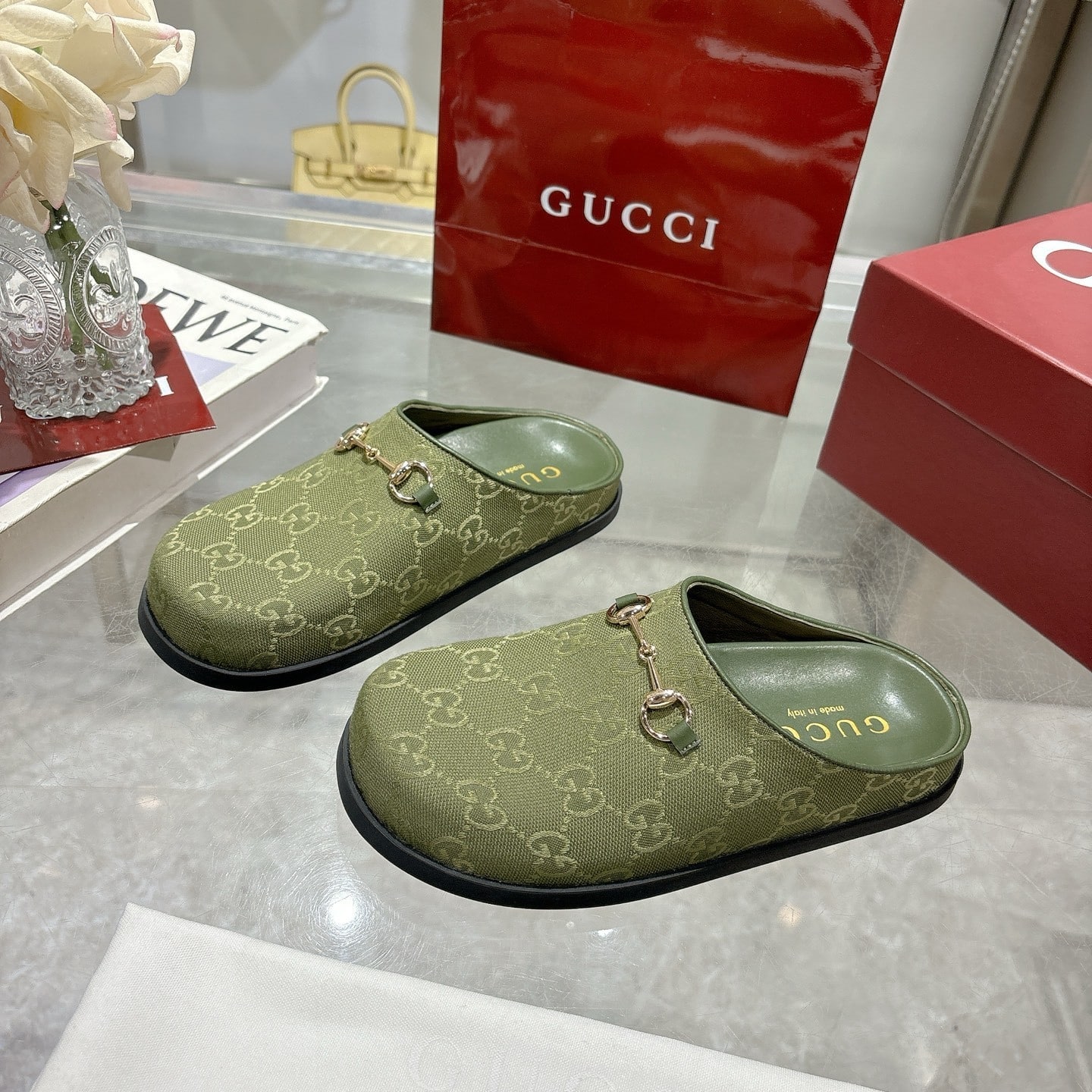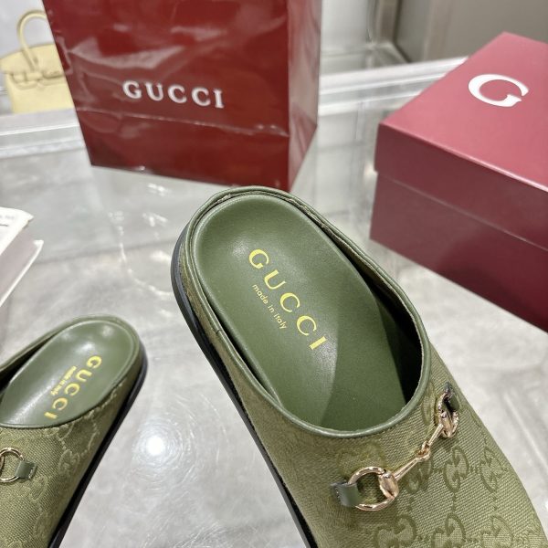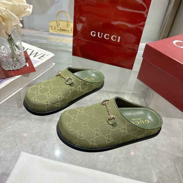 Description 1:1 Replica Shoes Dark green GG canvas Dark green leather trim Silver-toned hardware Leather lining Horsebit Round toe Rubber sole Flat