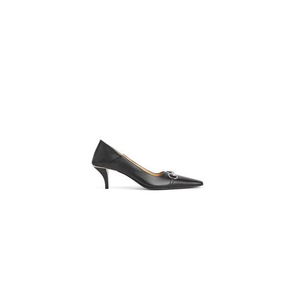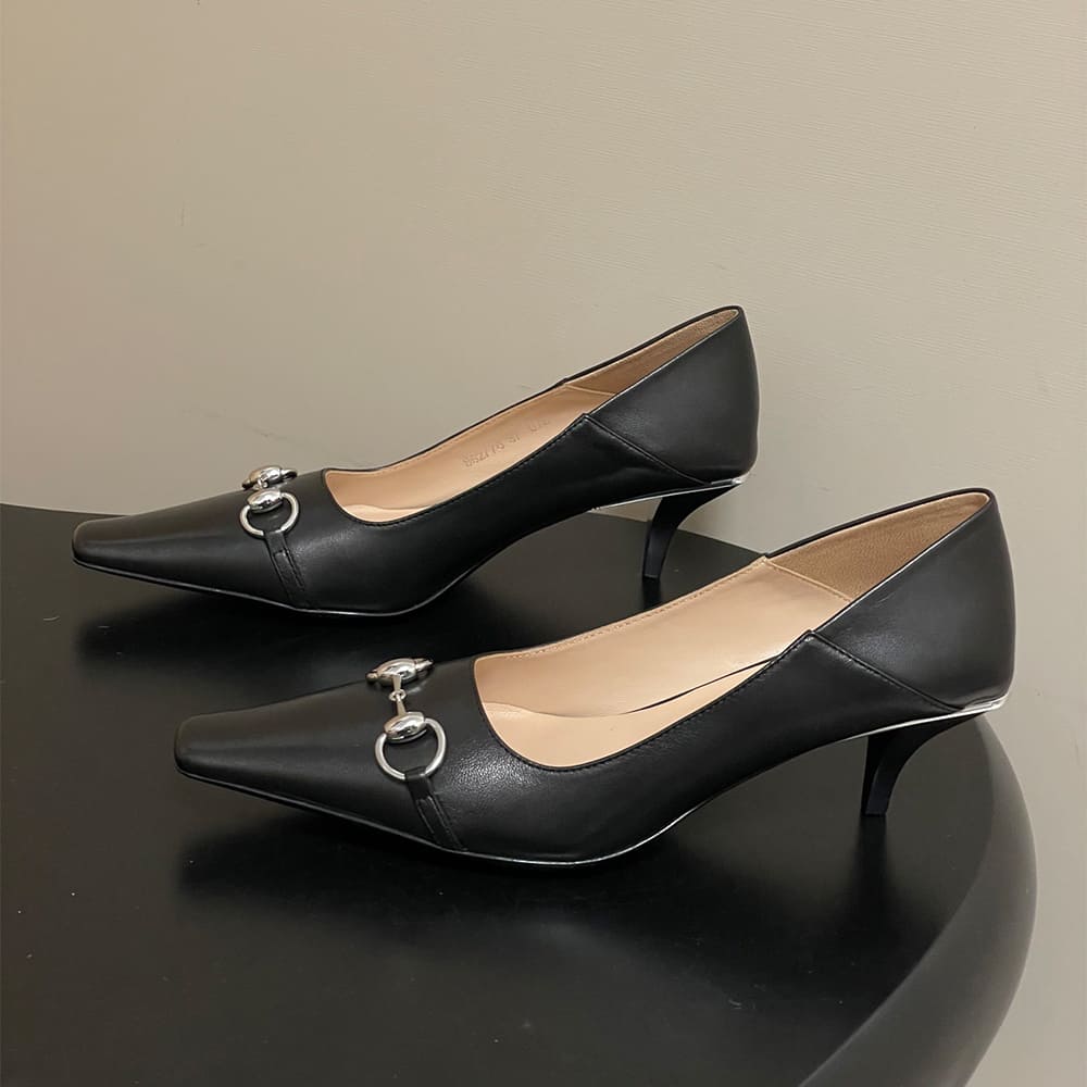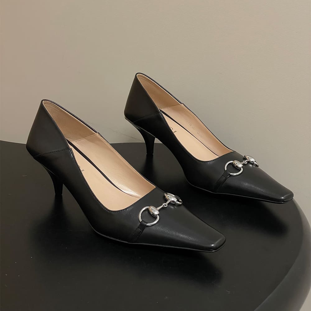 Cone-shaped, leather-covered heel, embellished with metallic plate