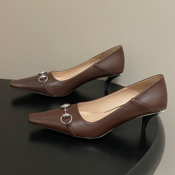 Cone-shaped, leather-covered heel, embellished with metallic plate