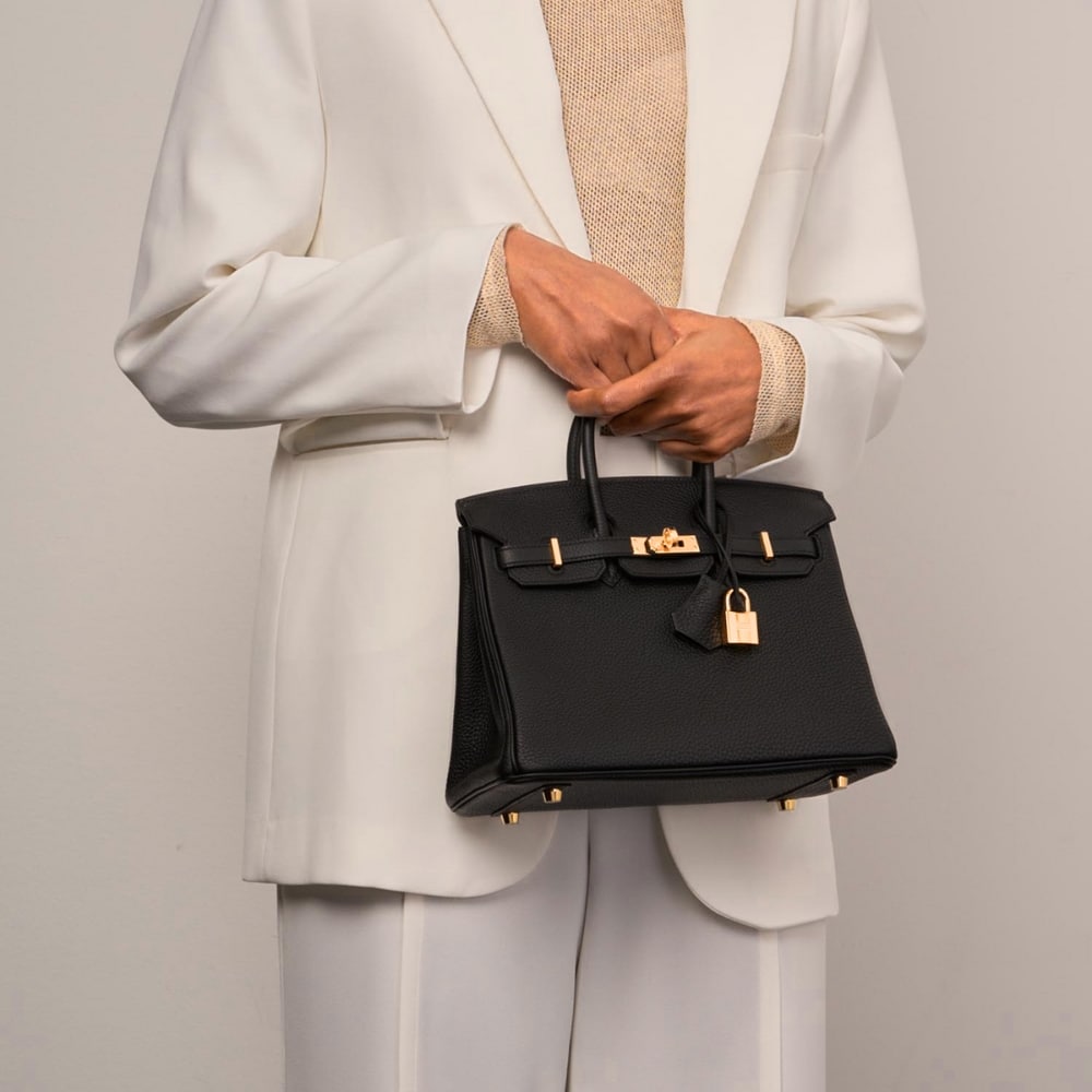 The Hermès Birkin 25 in Togo Black is the ultimate symbol of timeless luxury, with its supple grained leather, structured silhouette, and radiant gold hardware. Exuding power and refinement, it affirms prestige and sophistication for those who command elegance with effortless authority.