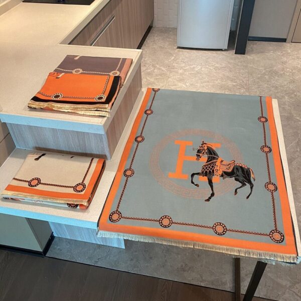 The HermĂšs Cashmere Muffler in blue captures the Maisonâs equestrian heritage with bold artistry and refined design. Its striking motif and timeless elegance make it a statement of sophistication, perfect for those who embody prestige and elevated style.