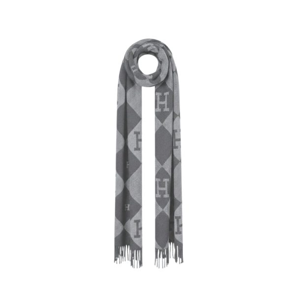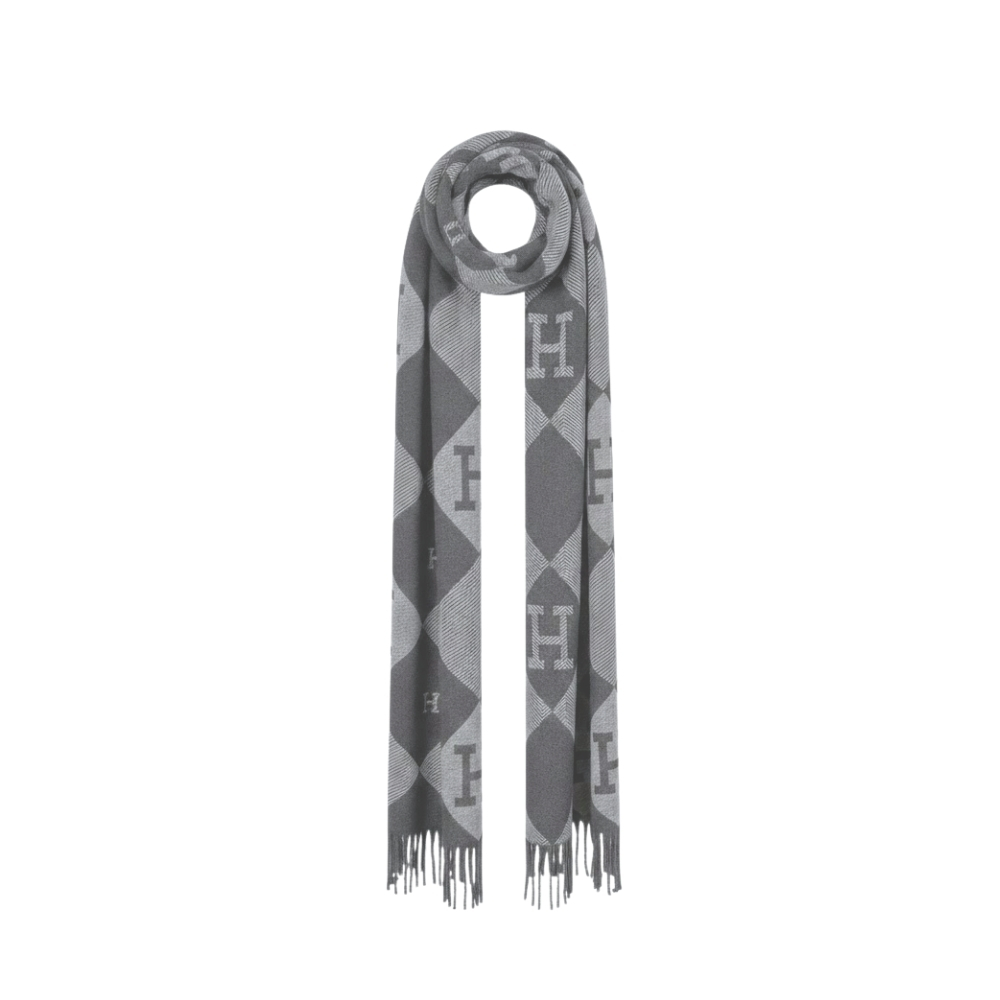 The Hermès Diamond H Logo Wool Shawl in gray is a luxurious accessory featuring an intricate jacquard-woven diamond motif with contrasting “H” signatures. Crafted from wool and cashmere blend, its generous proportions allow it to be styled elegantly as both a voluminous wrap or a classic muffler. Finished with delicate fringed edges, this timeless piece perfectly combines the Maison’s equestrian heritage with modern geometric design.