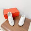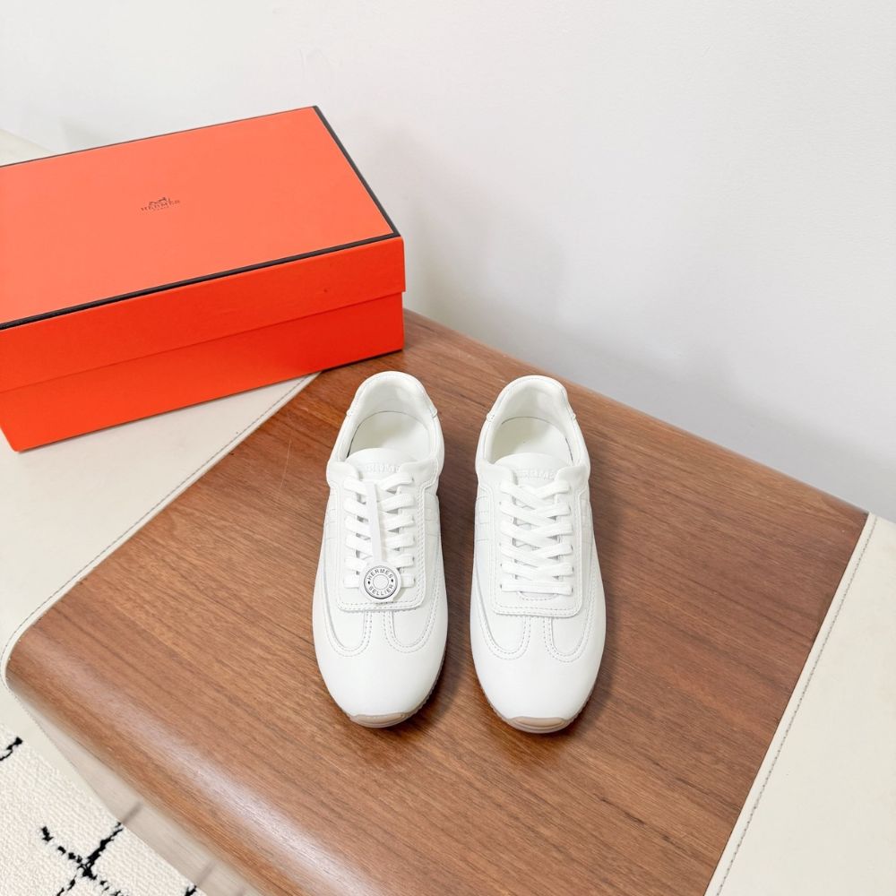 These HermĂšs sneakers boast an elegant and sophisticated look. The minimalist design is highlighted by an embroidered âHâ logo on the side, paired with white laces and a contrasting black rubber sole. These sneakers are designed for comfort and style, perfect for those who appreciate luxury.