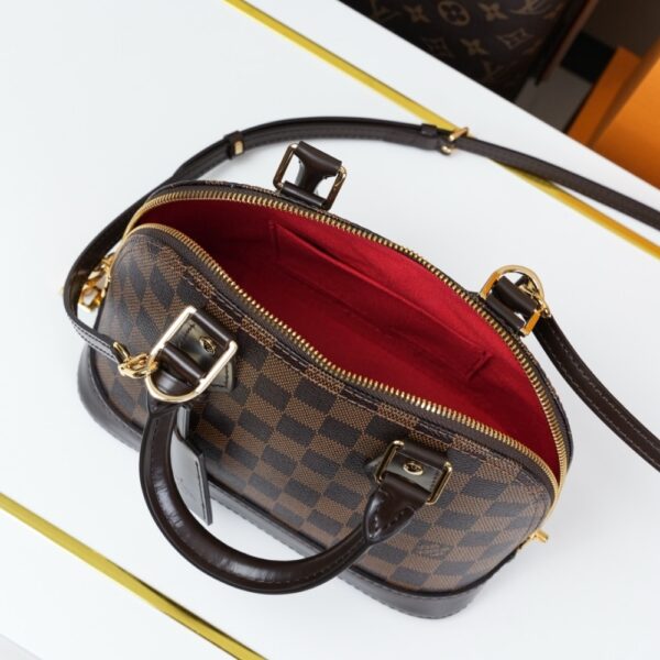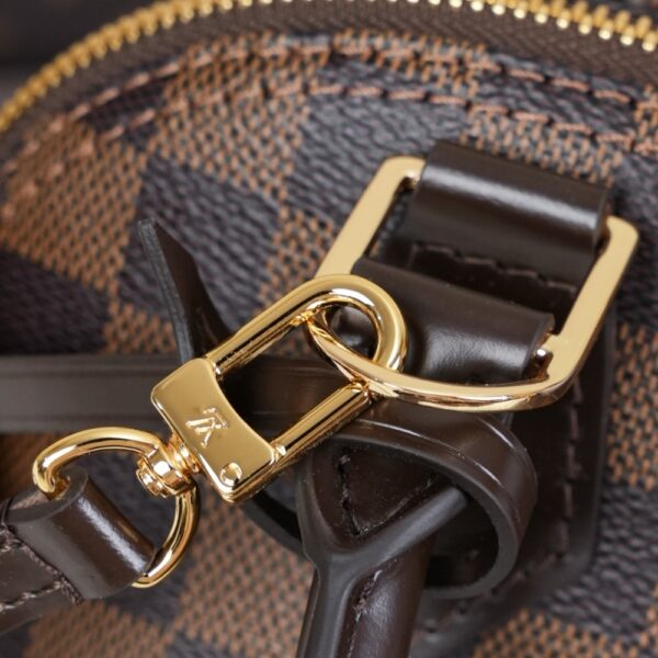 The Alma BB bag exudes the elegance of the Art Deco style inherited from the original Alma bag launched in 1934. Made from Damier Ebene Canvas, this version is marked by signature details such as a gold-tone lock and key, two Toron handles and a leather bell-shaped key tag. The petite design is suitable for crossbody wear thanks to the easily removable and adjustable strap.