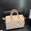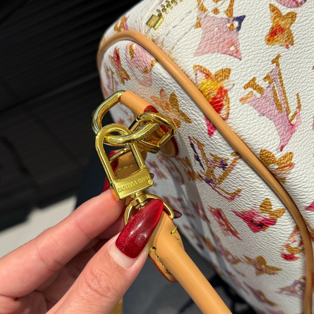 The Louis Vuitton Aquarelle Watercolor Speedy 35 in white is a rare and vibrant collector’s piece that reimagines the classic silhouette through a creative, artistic lens. Featuring the stunning Monogram Watercolor canvas designed by Richard Prince. The structured doctor-bag shape is elegantly complemented by leather trim, rolled top handles, and polished gold-tone hardware for a sophisticated finish. Its spacious interior, lined in soft textile, provides ample room for all your essentials, making it an ideal choice for the fashion enthusiast who appreciates a blend of heritage craftsmanship and modern art.