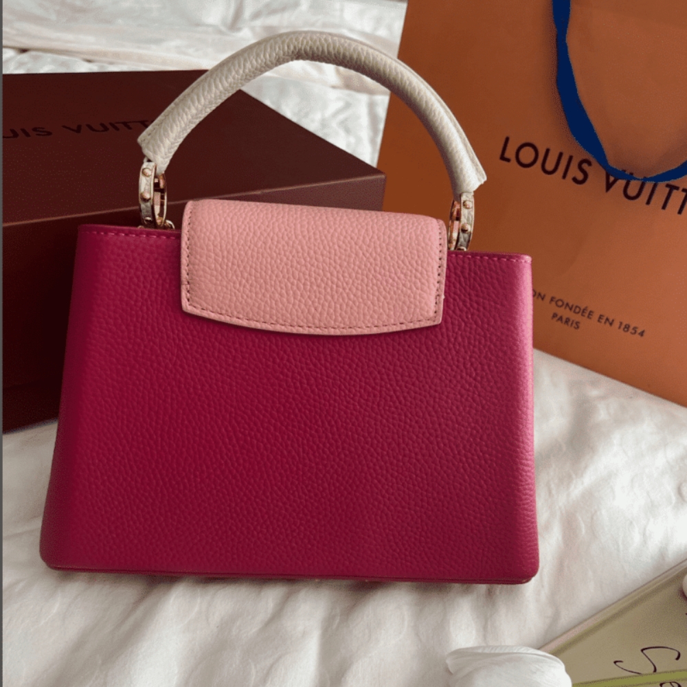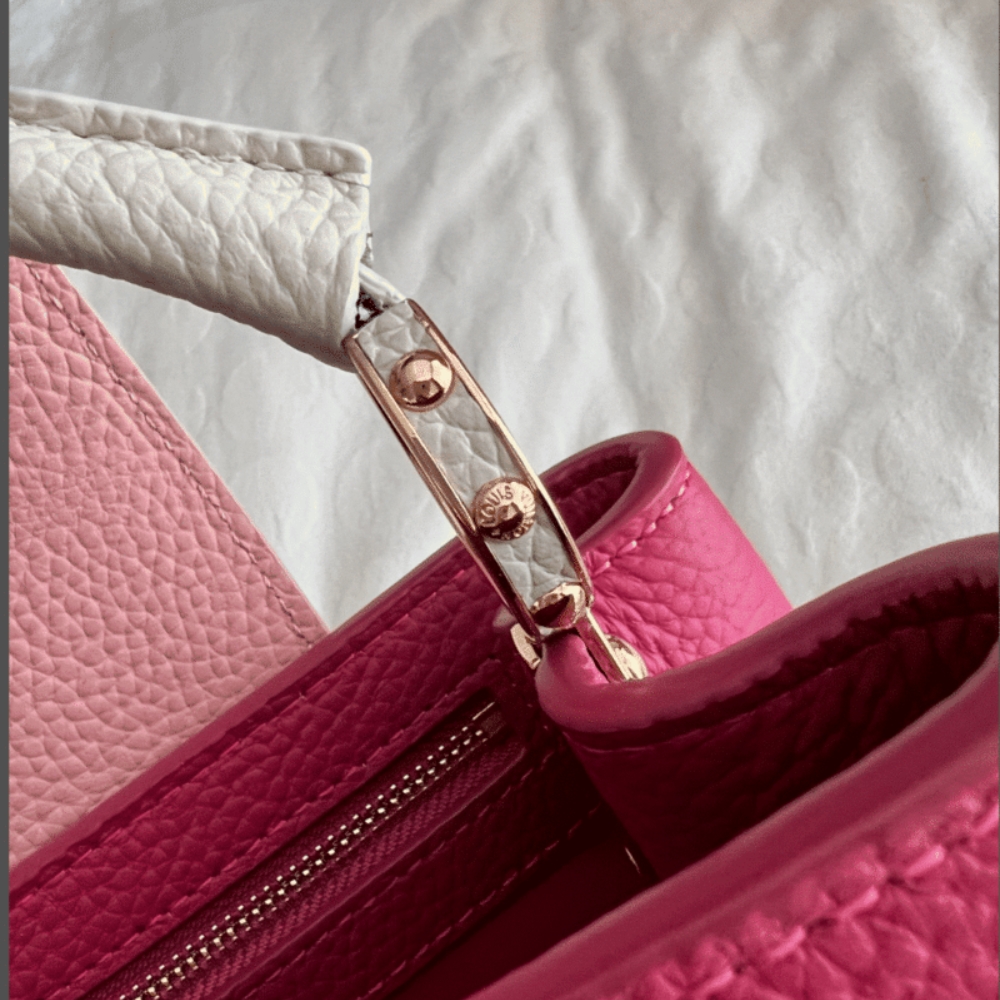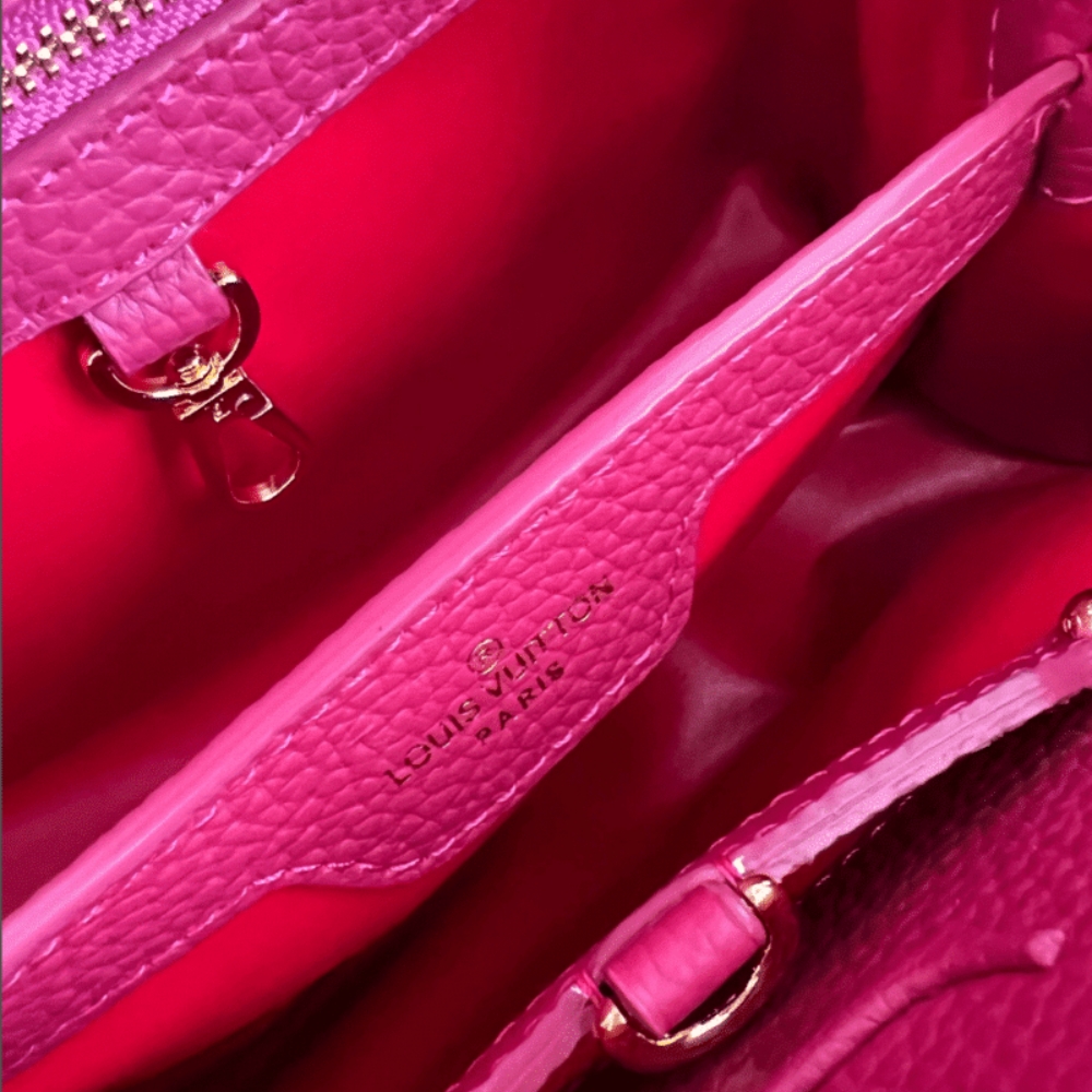 This very feminine Capucines Mini bag is made from leather with light pink on the flap and top handle. It features a gold-colour chain decorated with enamel Monogram Flowers for shoulder carry as well as a detachable, thin leather strap for cross-body and shoulder wear.